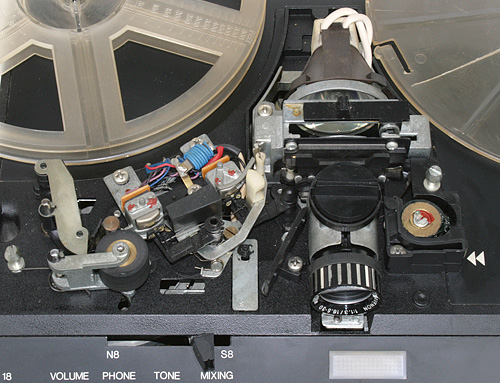 Der gesamte Filmtransport erfolgt nur durch Gummirollen und einen Greifer. Normal 8 und Super 8 Filme können hintereinander auf eine Spule gewickelt werden! Beim Übergang muß nur der Formatschieber umgestellt werden und der Projektor projiziert störungsfrei weiter.
