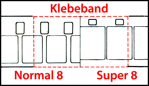 Aus der Bedienungsanleitung: Die beiden Filmenden werden mit Klebeband auf Stoß zusammengefügt. Wenn der Projektor die Stelle mit dem Formatwechsel erreicht, weicht der Greifer aus der Perforation zurück. Nach umstellen des Formatschiebers wird die Projektion fortgesetzt ohne das der Projektor angehalten werden muß. Bildbühne und Greifer werden dabei automatisch angepasst.