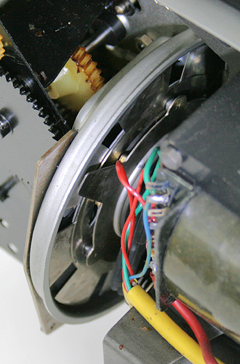 Blick auf die Umlaufblende in Zeitlupenstellung. Bei der Projektion mit 5 B/sek. fächert sich die Umlaufblende von 3 auf 9 Sektoren auf, wodurch auch bei Zeitlupenprojektion ein flimmerfreies Bild möglich wird.