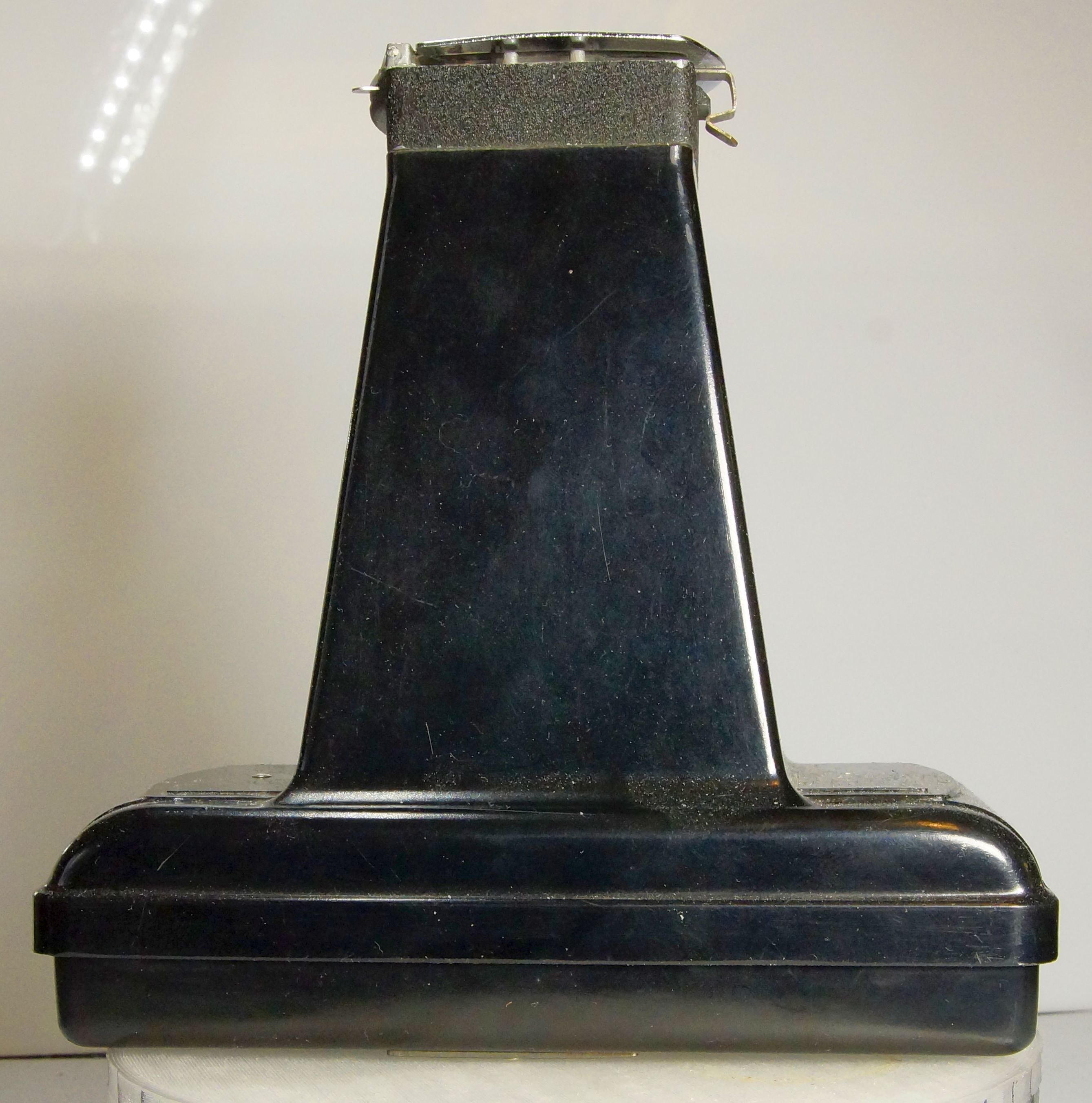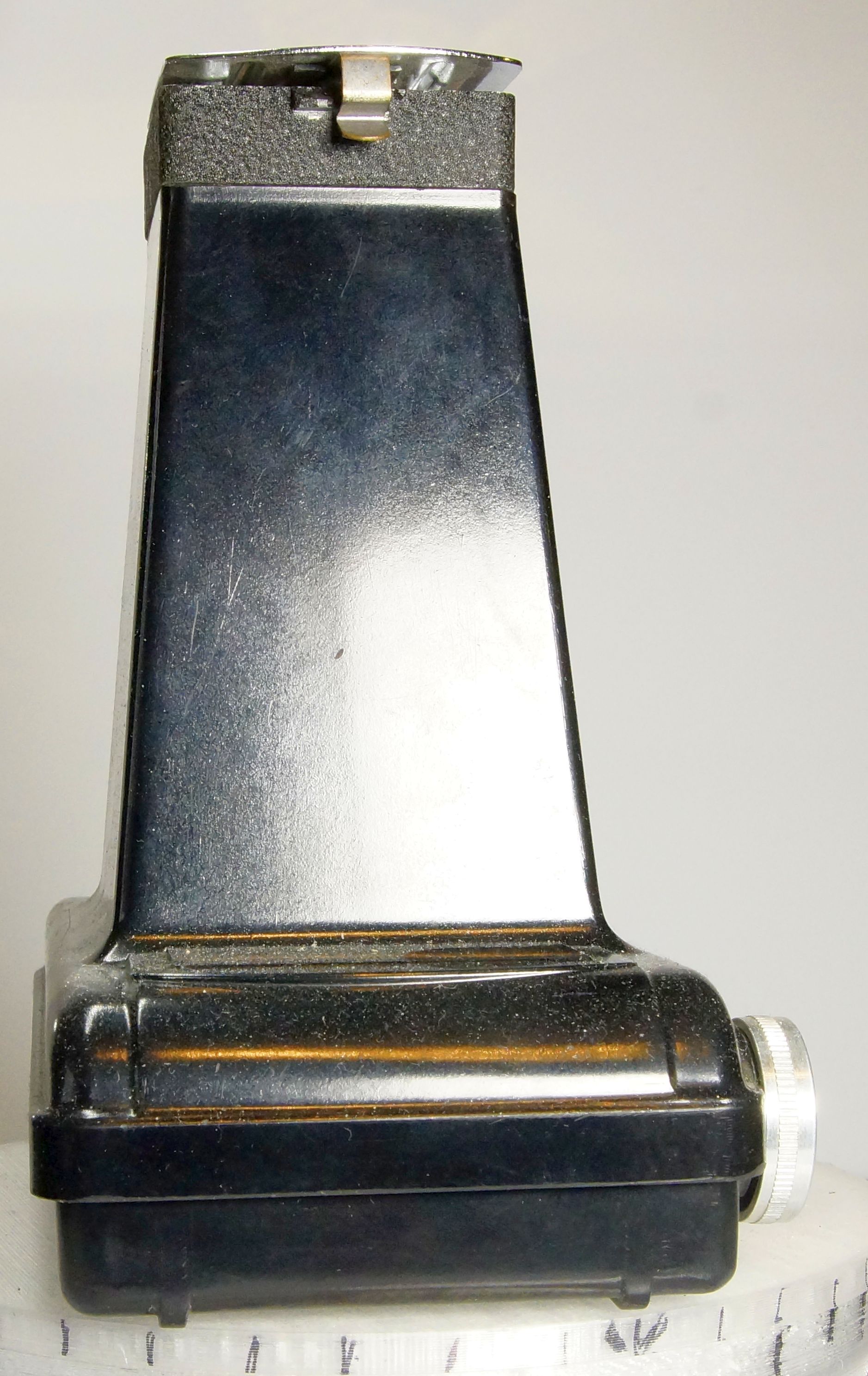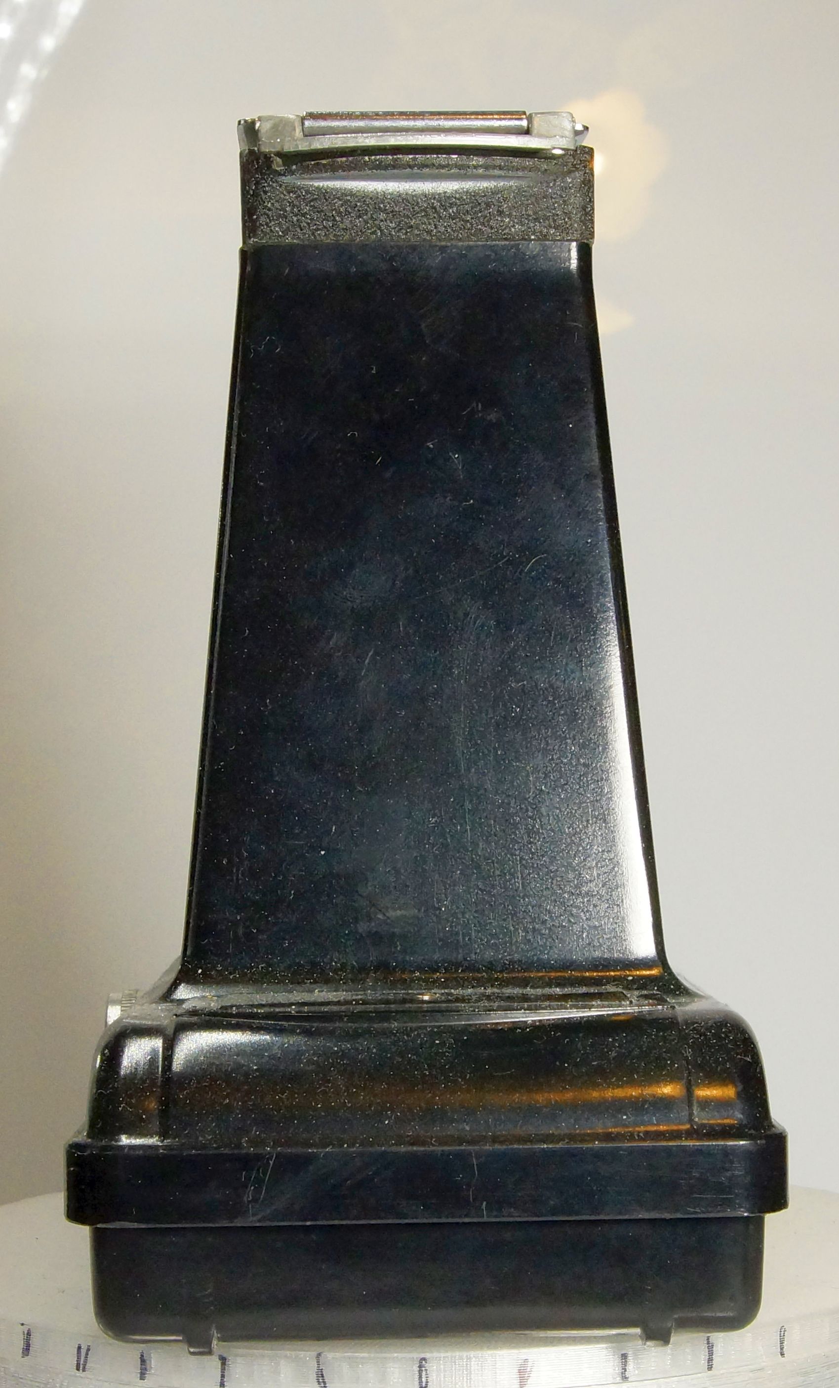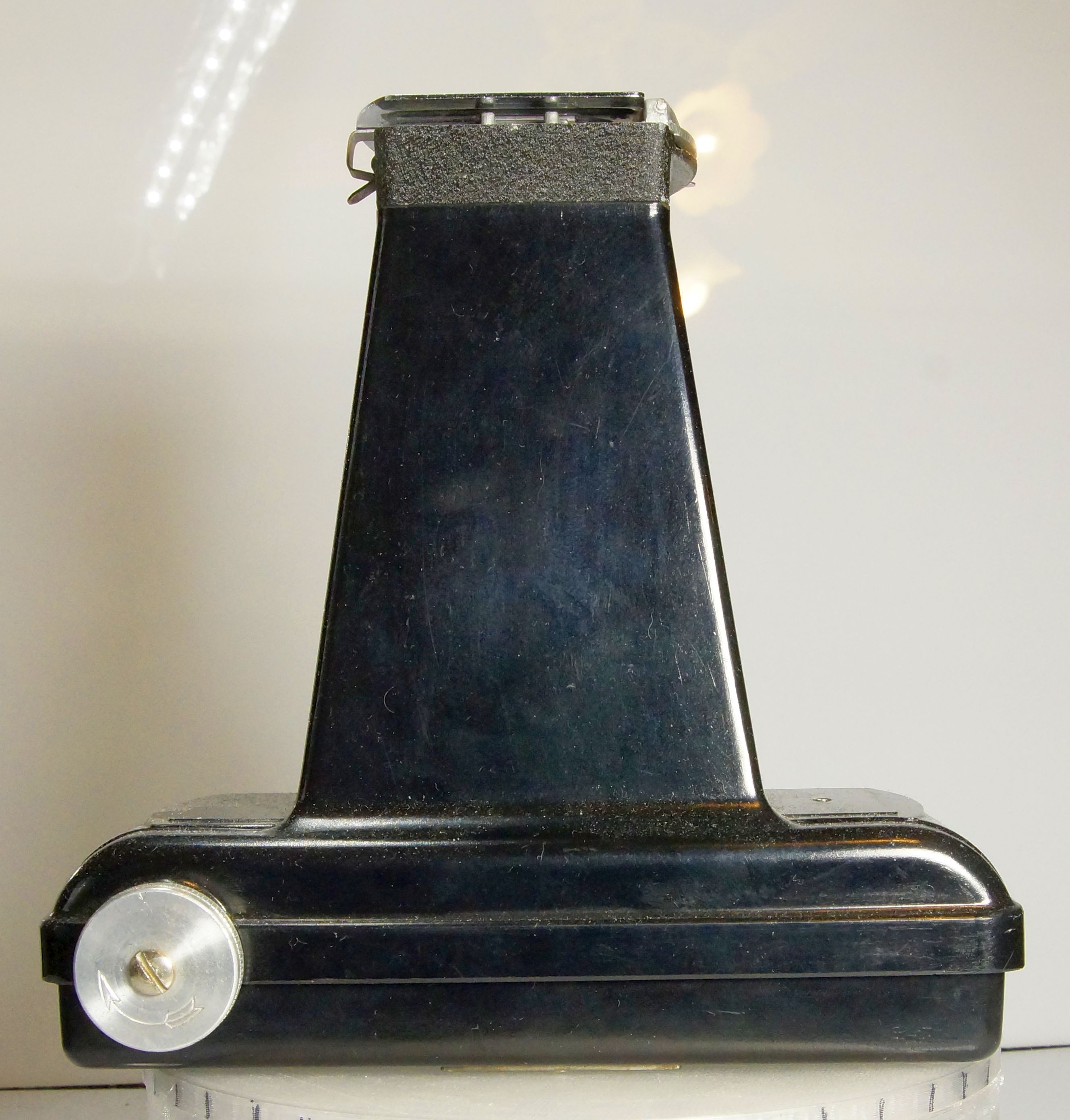 Diese Kamera kam mit einem Konvolut zu mir, und da sie ungewöhnlich war, hab ich sie behalten. Im Prinzip ist es eine Rollfilmkamera für 120 Film mit extrem langem Tubus. Gemacht um 6 x 9 Negative von einem Super 8 Film aufzunehmen. Produziert wurde sie von der Testrite Instrument Company 1948, und der komplette Body ist aus Bakelit.