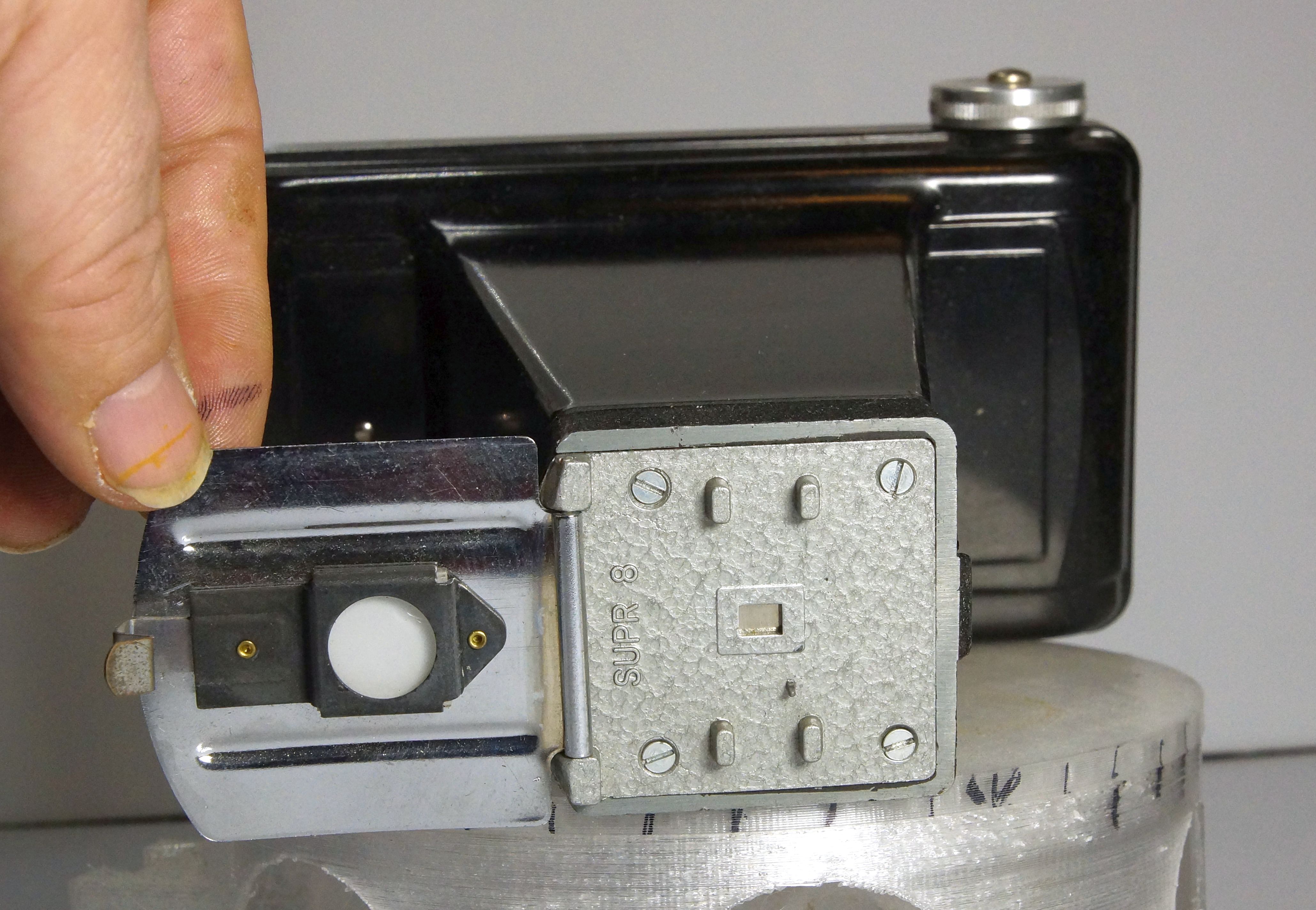 Soweit ich das sagen kann wird der Super 8 Film, nach aufklappen der Vorderseite zwischen den 4 Metallnoppen eingeführt und bis zum gewünschten Einzelbild geführt. Dann wird das Vorderteil geschlossen was gleichzeitig den Film fixiert, einmal durch Andruck. Ausserdem scheint eine kleine Metallnoppe in die Perforierung zu greifen, danach wird belichtet.