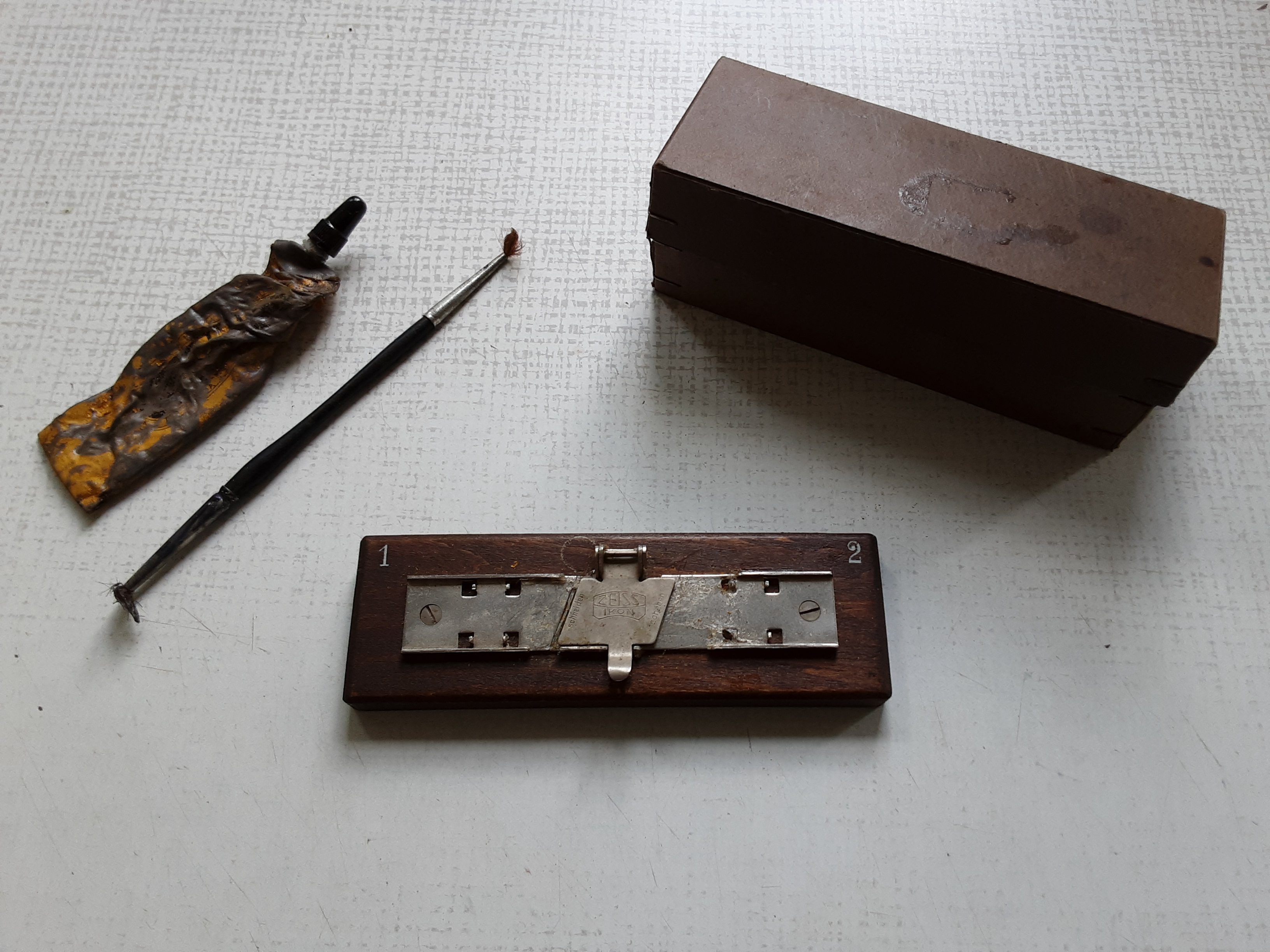 Der Gegenstand auf den Bildern lag in einem Koffer aus Vorkriegszeit in dem ein Agfa Filmprojektor enthalten ist. Die Marke ist Zeiss Ikon und auf der ein Seite steht "Schneiden" auf der anderen "Schaben". Ist das möglicherweise zum Filme schneiden? Kann jemand sagen ob das Gerät so vollständig und noch zu benutzen ist? Und kenn eventuell jemand die genaue Produktbezeichnung?