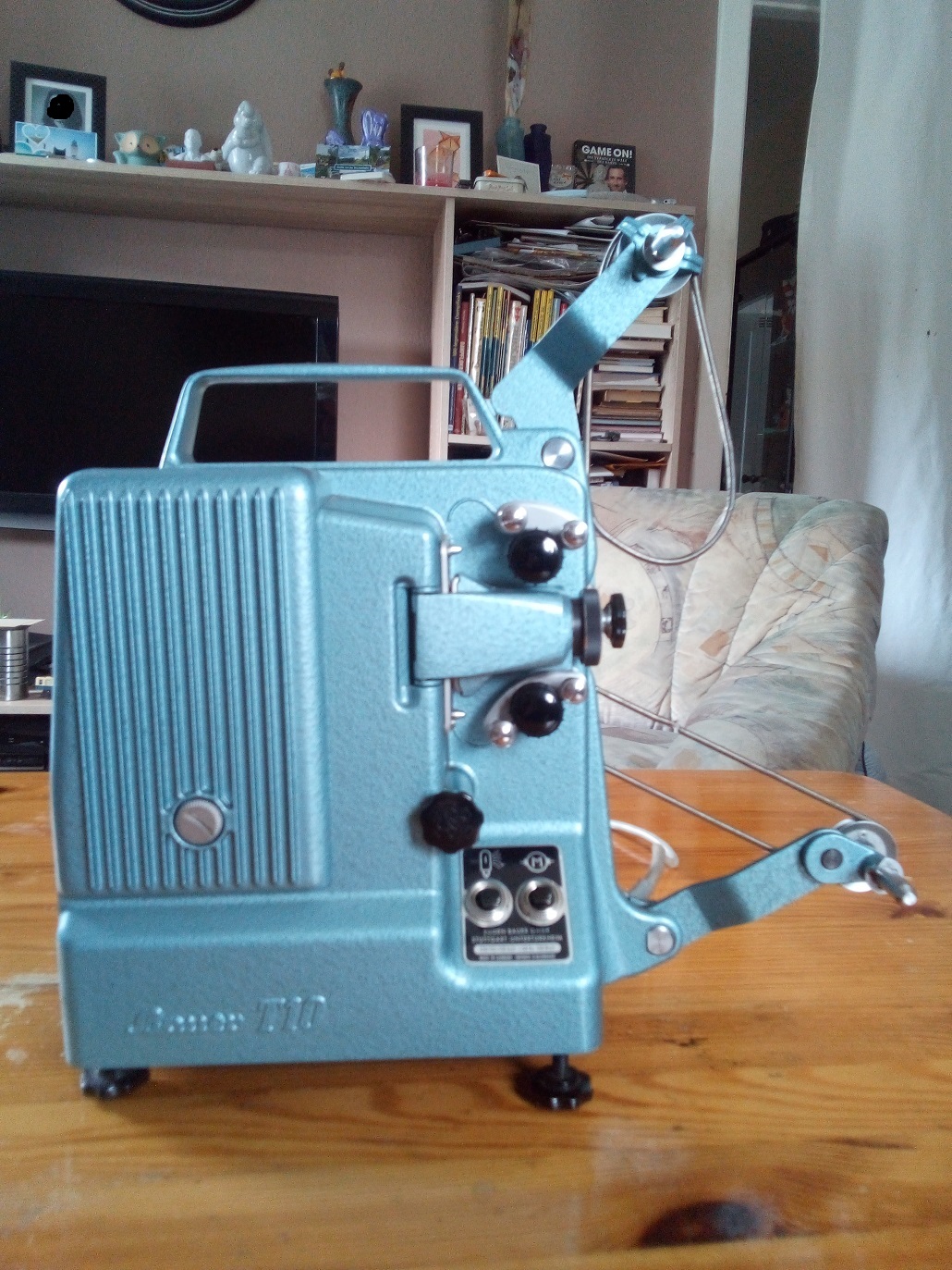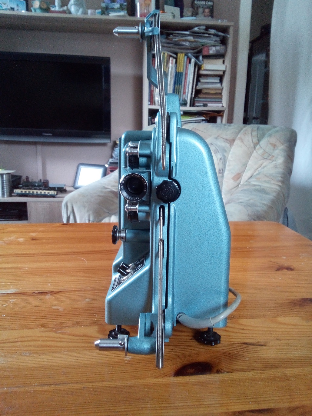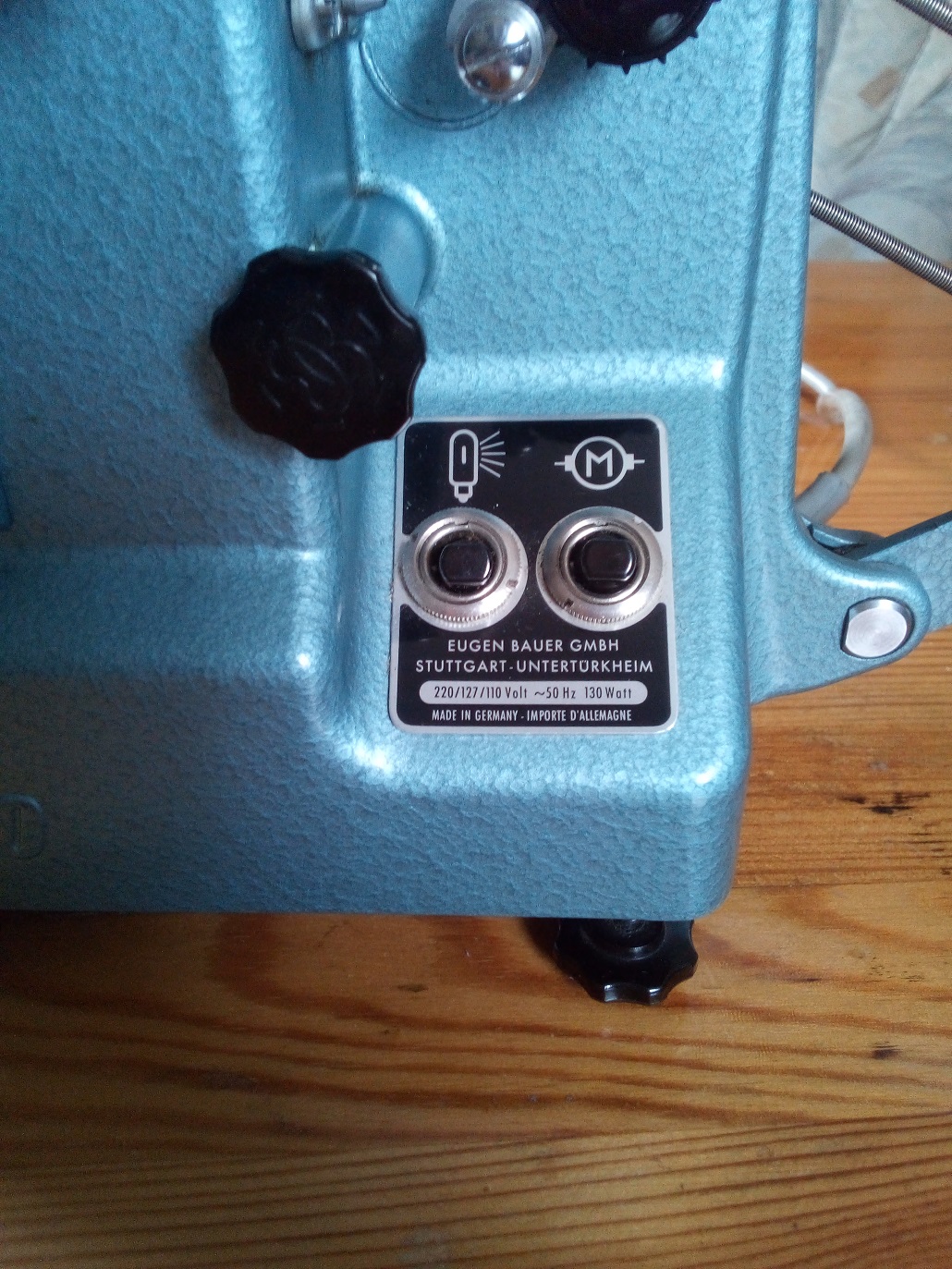 Hersteller: Eugen Bauer, Stuttgart-Untertürkheim Typ: Normal 8 Stummfilm Projektor Objektiv: ISCO-DUOTAR 1:1,5/20 Baujahr: 1957? max. Spulengröße: 120 Meter Spannung: 110 V, 127 V, 220 V Wechselstrom Lampe: 12 Volt, 100 Watt