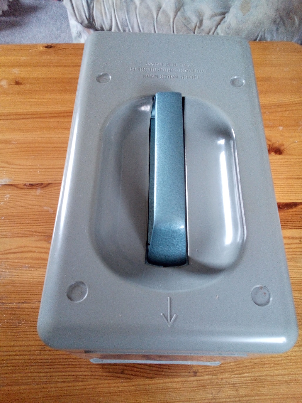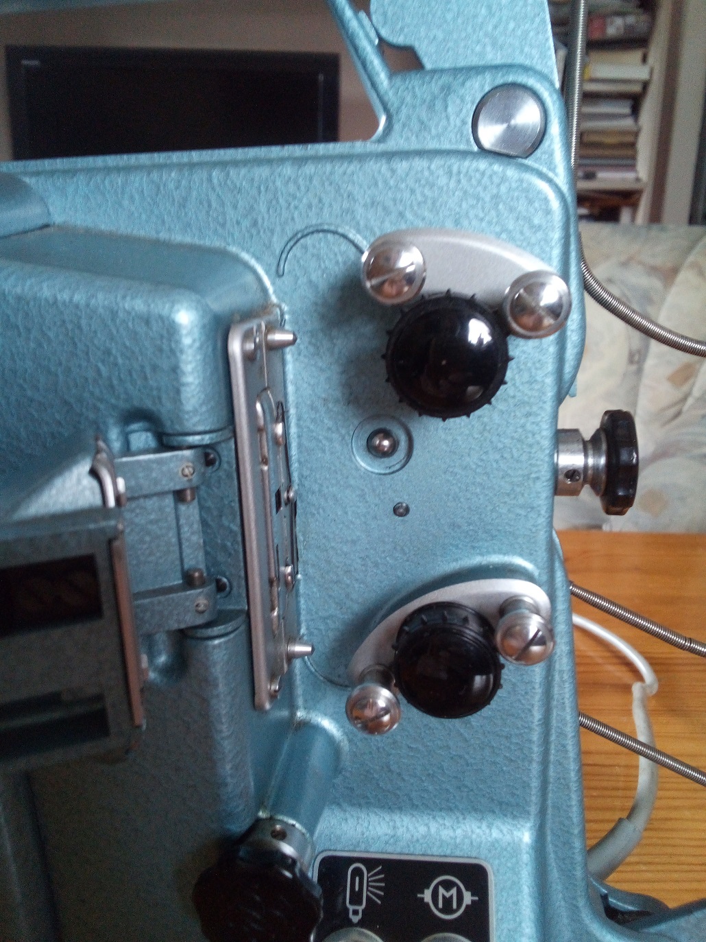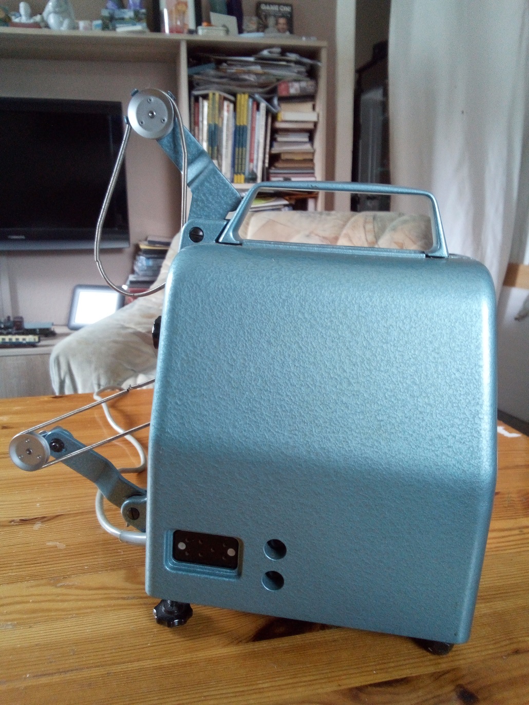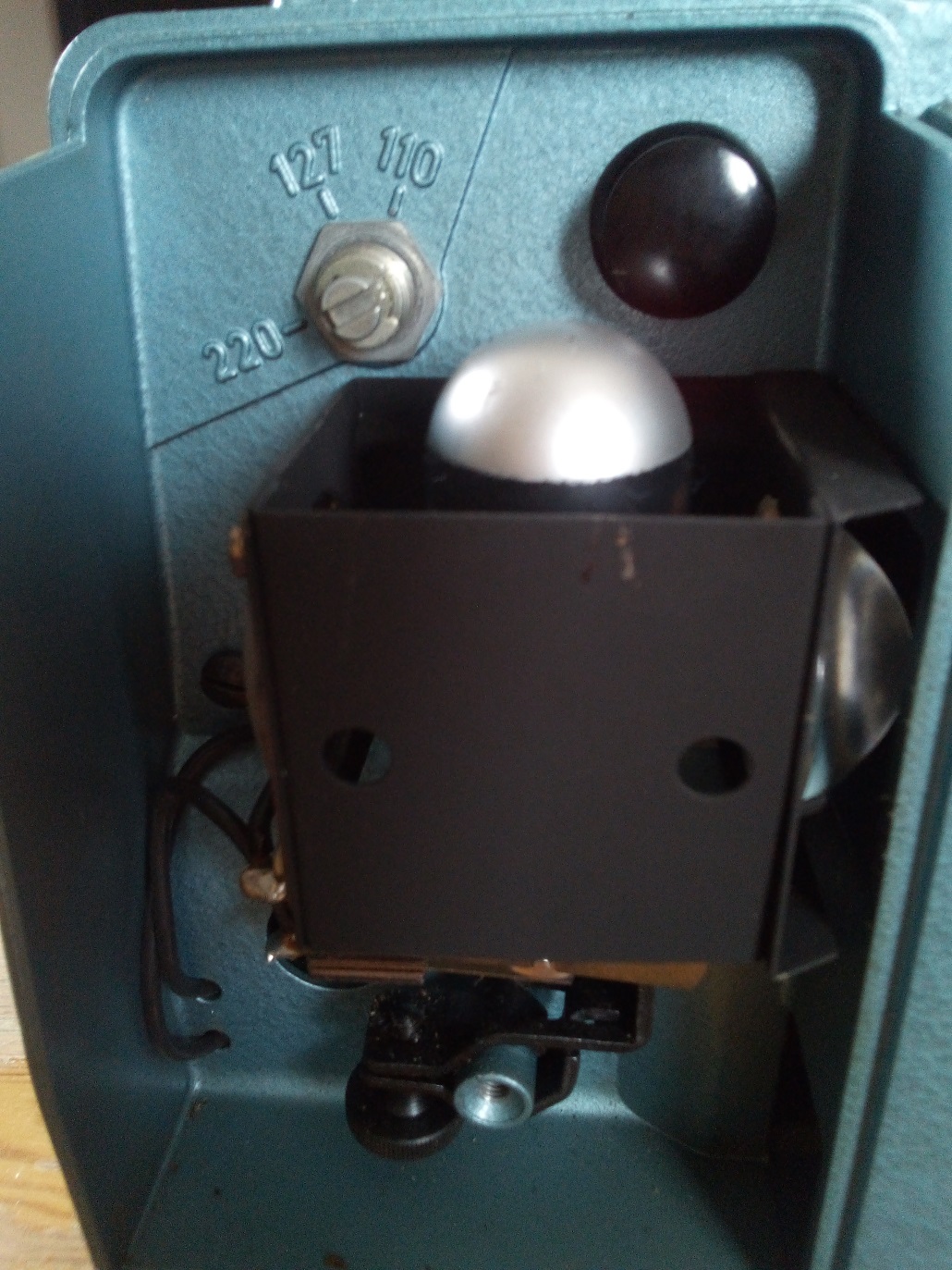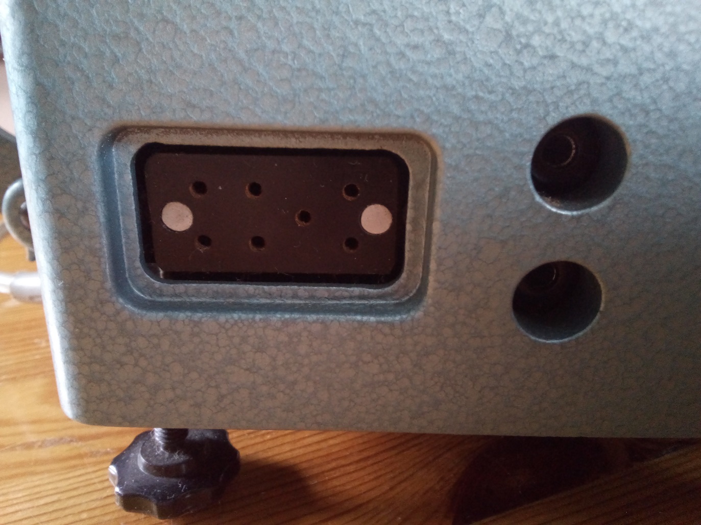 Passend zu der von Rainer gezeigten Bauer Doppel 8 Schmalfilmkamera 88E möchte ich aus dem Nachlaß meines Vaters den Stummfilmprojektor Bauer T10 vorstellen. Er kommt wie die 88E in einer Hammerschlag Optik daher. Gekauft wurde der Projektor wahrscheinlich im Jahre 1957. Jedenfalls stemmen die ersten Filme (gedreht mit einer Bauer 88E die ich ebenfalls aus dem Nachlaß meines Vaters besitze) aus diesem Jahr. Als Besonderheit bietet dieser Projektor die Möglichkeit, ihn unter 3 verschiedenen Wechselspannungen zu betreiben (110 V, 127 V und 220 V). Weiterhin konnte über ein "Tonkoppler" genanntes Zusatzgerät ein Tonband über einen Anschluß auf der Rückseite des Projektors angeschlossen werden.