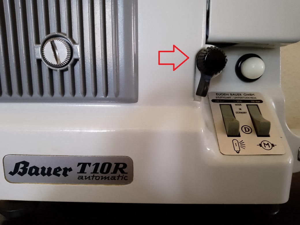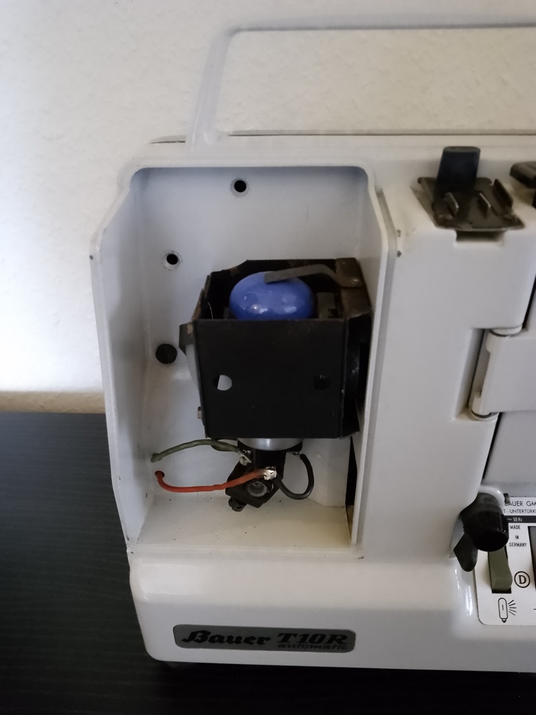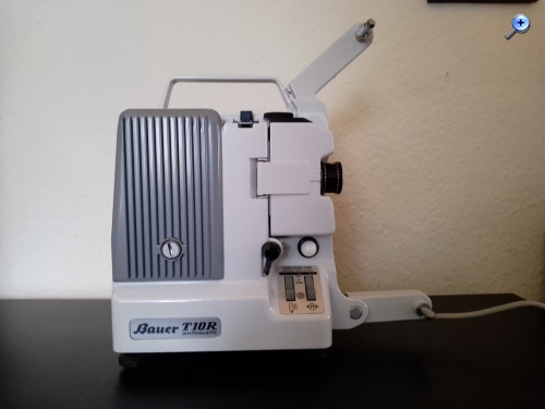Hersteller: Eugen Bauer, Stuttgart-Untertürkheim Modell: T10 R Automatic Typ: Normal 8 Stummfilm Projektor mit halbautomatischem Filmeinzug Objektiv:BAUER-PROJEKTIONSVARIO 1:1,4/15 - 25mm Baujahr: 1956 - 62 max. Spulengröße: 120 Meter Bildgeschwindigkeit: 16 Bilder/sec Spannung: 220 V Wechselstrom Lampe: 12 Volt, 150 Watt Radium Lampe Zubehör: Schutzhaube, gleichzeitig Projektionsständer