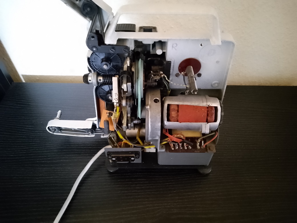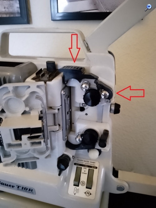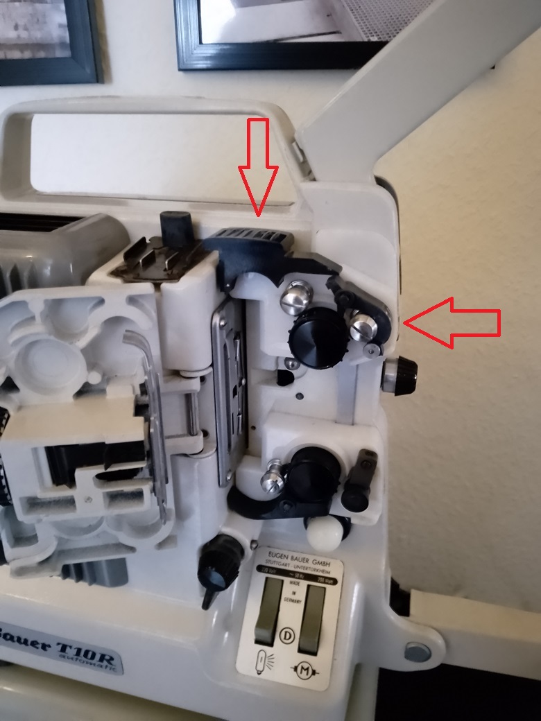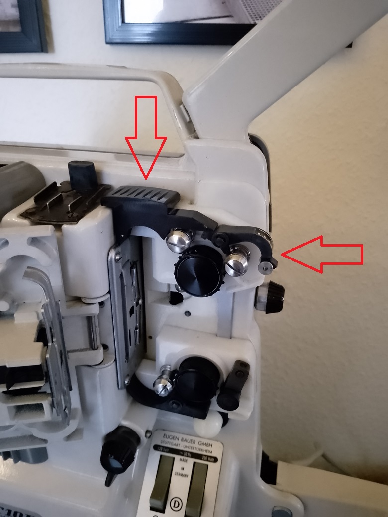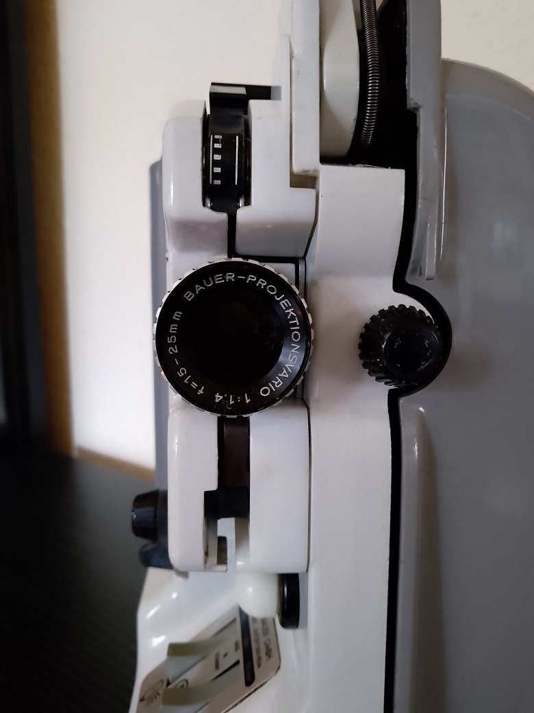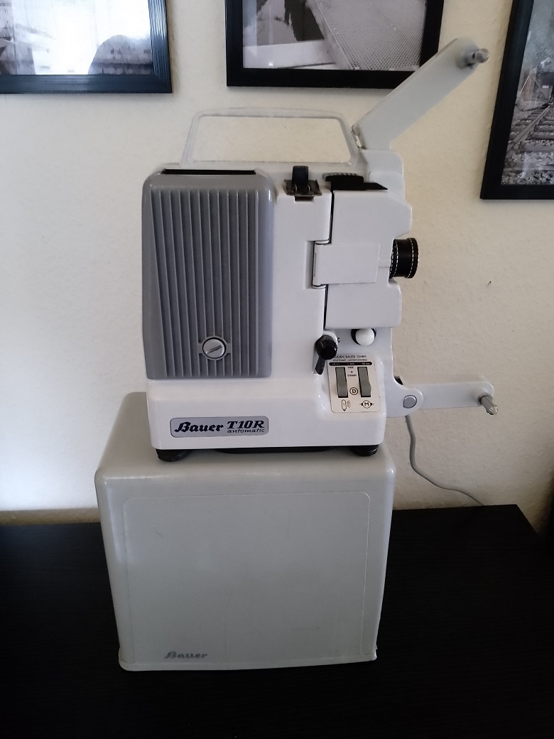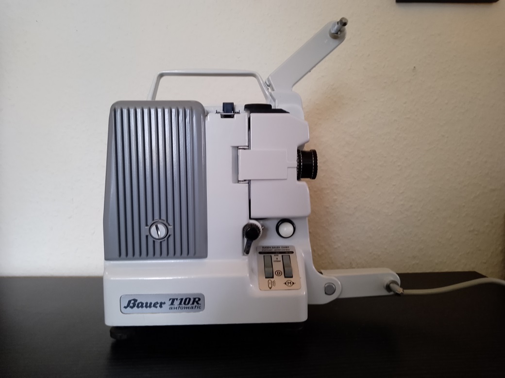 der Bauer T10 R Automatic ist ein weiterer Vertreter der Bauer T10 Normal/Doppel 8 Projektorfamilie. Das "R" steht in diesem Fall für REVERSE, da mit diesem Projektor Rückwärtsprojektionen möglich sind. Weiterhin ist der Projektor in der Lage Standbilder auf die Leinwand zu werfen. Den T10 R gab es in der einfachen Variante mit manueller Filmeinfädelung oder in der hier gezeigten Automatic Version mit halbautomatischem Filmeinzug. Im Netz findet man auch Ausführungen mit den "klassischen" Spulenarmen und freiliegenden Drahtpeesen. Beim gezeigten Modell laufen die Peesen innerhalb der Spulenarme.