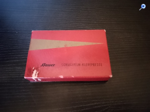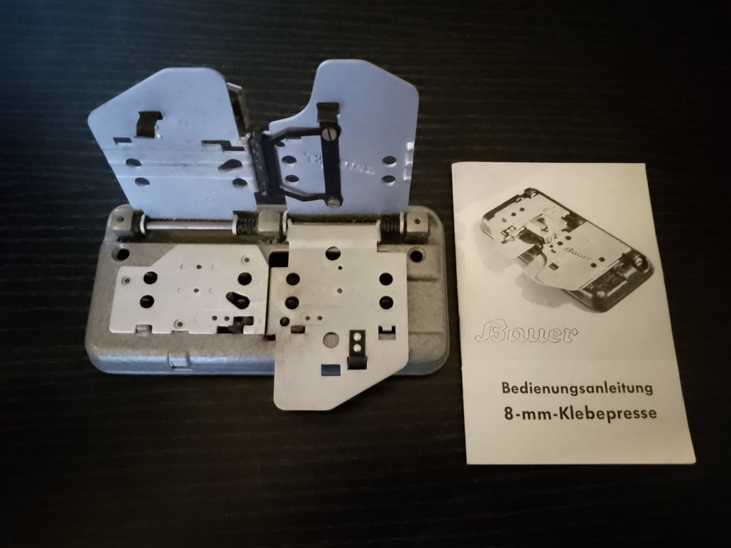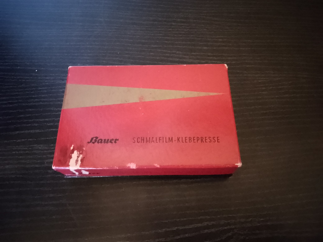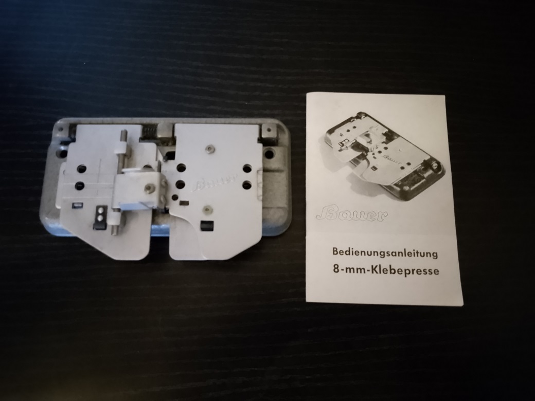 die Bauer Nassklebepresse für das Format Normal 8 / Doppel 8 ist eine typische Vertreterin ihrer Art aus den 1950er / 60er Jahren. In einem Bauer Prospekt von 1957 wird ein Verkaufspreis von 28,80 DM genannt. Der Preisaufkleber (36,-- DM) auf dem Karton des hier gezeigten Exemplars läßt darauf schließen, daß diese Klebepresse deutlich nach 1957 den Weg zu einem Schmalfilmfreund gefunden hat.