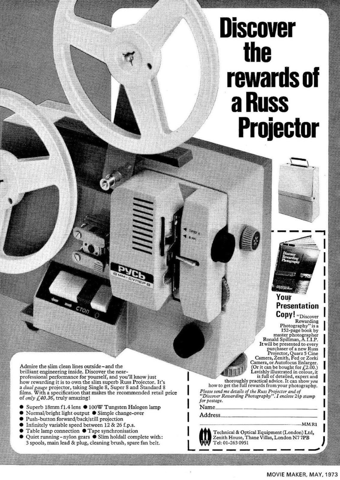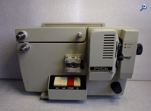 in den Jahren 1969 - 1975 produzierte LOMO, (Leningradskoje Optiko-Mechanitscheskoje Obedinenije oder in kyrillischen Buchstaben Ленинградское оптико-механическое объединение) die Leningrader Optisch-Mechanische Vereinigung, im damaligen Leningrad (heute St. Petersburg) den Projektor "Russ" als Zweiformatprojektor für das damals schon etwas angestaubte Normal/Doppel 8 Format und das modernere Super 8.