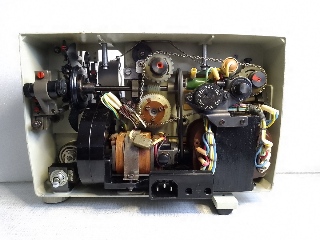 Sehe ich das richtig, dass der Spannungswähler direkt an das hochkant stehende Blechpaket des Trafos angeschraubt ist? Krass. Die Filmschleifen müssen ja sehr groß sein, damit der Film nicht am Gehäuse entlang schrammt. Das Schaltverhältnis muss recht kurz sein, da die Blendenflügel schmal sind, das gibt viel Licht, deshalb das unkonventionwelle Beleuchtungssystem wie bei alten 35mm-Projektoren.