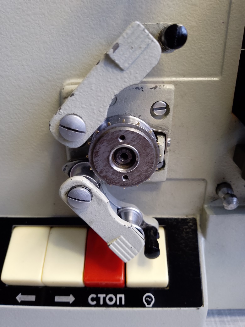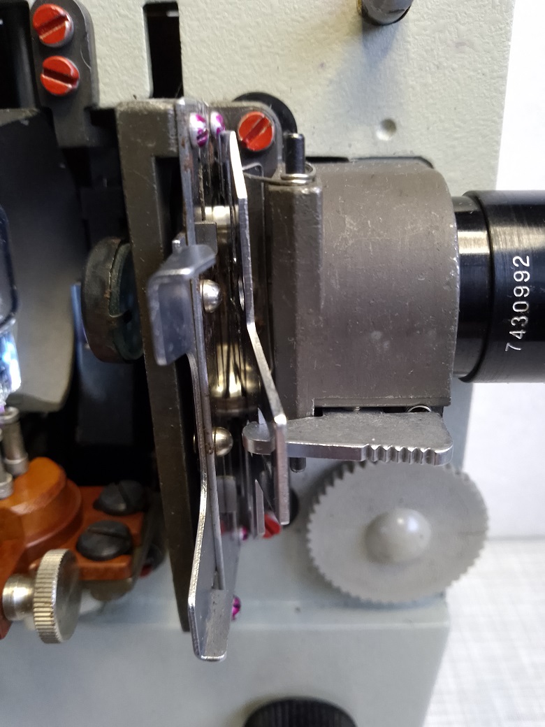 Um das Format zu wechseln ist die dem vorzuführenden Filmformat entsprechende Zahntrommel auf die Antriebsachschse aufzustecken und die Filmbühne entsprechend durch verschieben einzustellen. Für den größeren Lochkreis von Super 8 Spulen finden sich im Zubehör Adapterstücke (beim gezeigten Gerät leider nur noch ein Adapter vorhanden). Wichtig bei beiden Formaten ist, dass die Andruckplatte plan auf dem Film aufliegt.