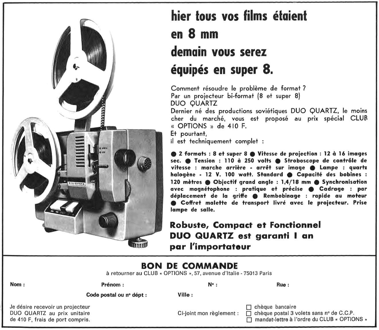 und zwei Anzeigen aus den 1970er Jahren die belegen, dass der Projektor "Russ" auch im nichtsozialistischen Wirtschaftsgebiet verkauft wurde.