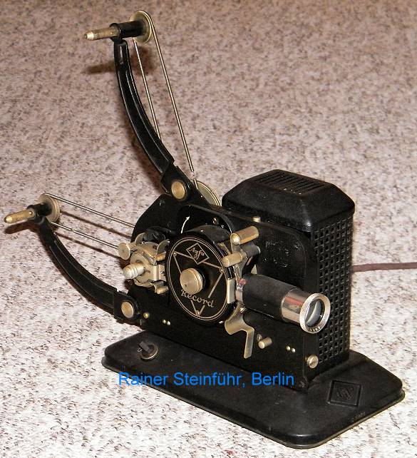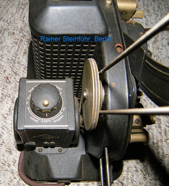Bemerkung: Metall--Spiralen-Pesen. Geschwindigkeit variabel von Hand stellbar, für 110 und 220 getrennt. Drucktaster auf dem Geschwindigkeitsknopf beachten. Bildstand-Einraster. Rückspulung durch Wechsel der Spulen mit links-rechts-Verdrehung. Mit dem Drehknopf auf dem grossen Rundteil in der Mitte kann das saubere Eingreifen des Schrittschiebers justiert werden (Bild ). Die Kollektorkappen des Motors können getauscht werden (ganz links auf Bild 3).