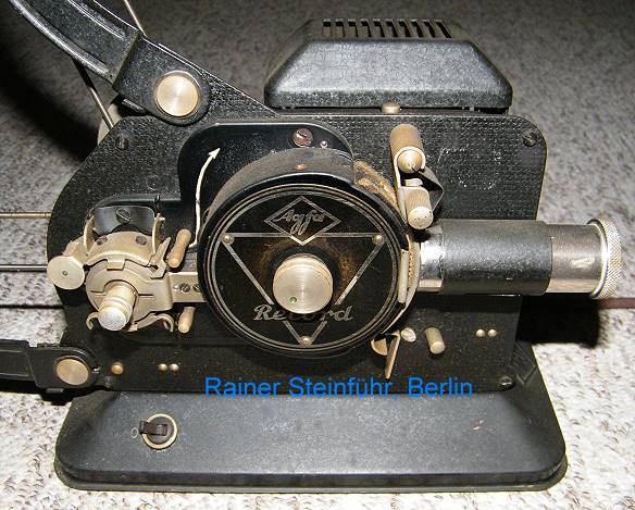 Ich vermute es geht um die runde Mutter auf der Antriebsachse oberhalb des Lichtschalters. Statt der Mutter kann hier eine Handkurbel angeschraubt werden. Es gab diesen Projektor auch in einer Ausführung ohne Motorteil. Ähnlich wie beim Ozaphan-Projektor konnte/musste dann eifrig gekurbelt werden.