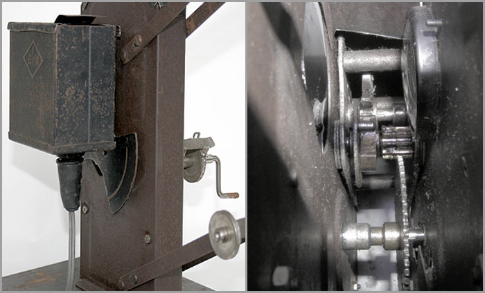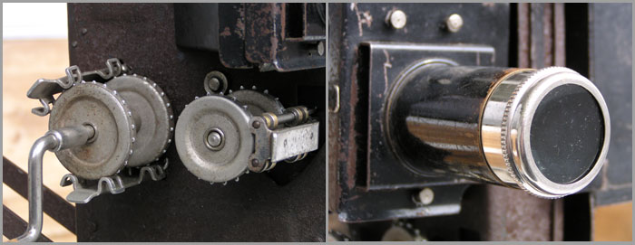 Links: Filmtransporttrommeln und Handkurbel, Rechts: Projektionsobjektiv