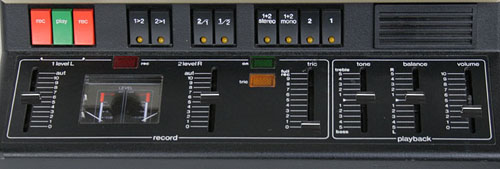 Aussteuerung: Automatik oder manuell getrennt für jede Spur über Schieberegler, 2 VU-Meter