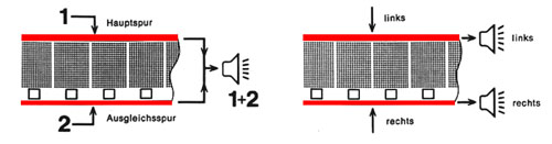 Wiedergabe: Mono oder Zweispur, Duoplay Automatik - Beide Spuren werden gemeinsam wiedergegeben, der Toninhalt einer Spur (z.B. Sprache) steuert die Lautstärke der zweiten Spur (Musikabsenkung).
