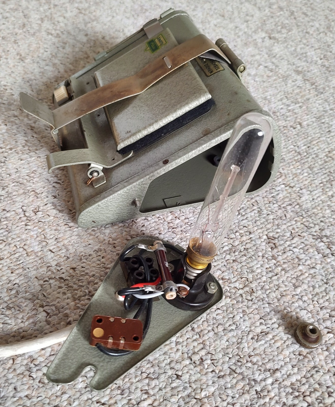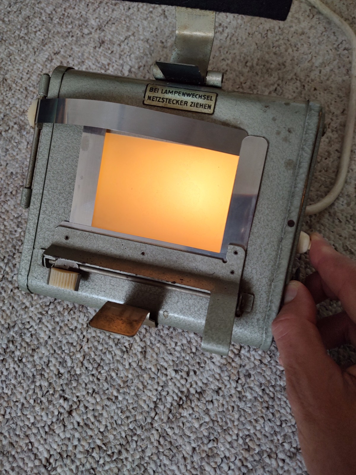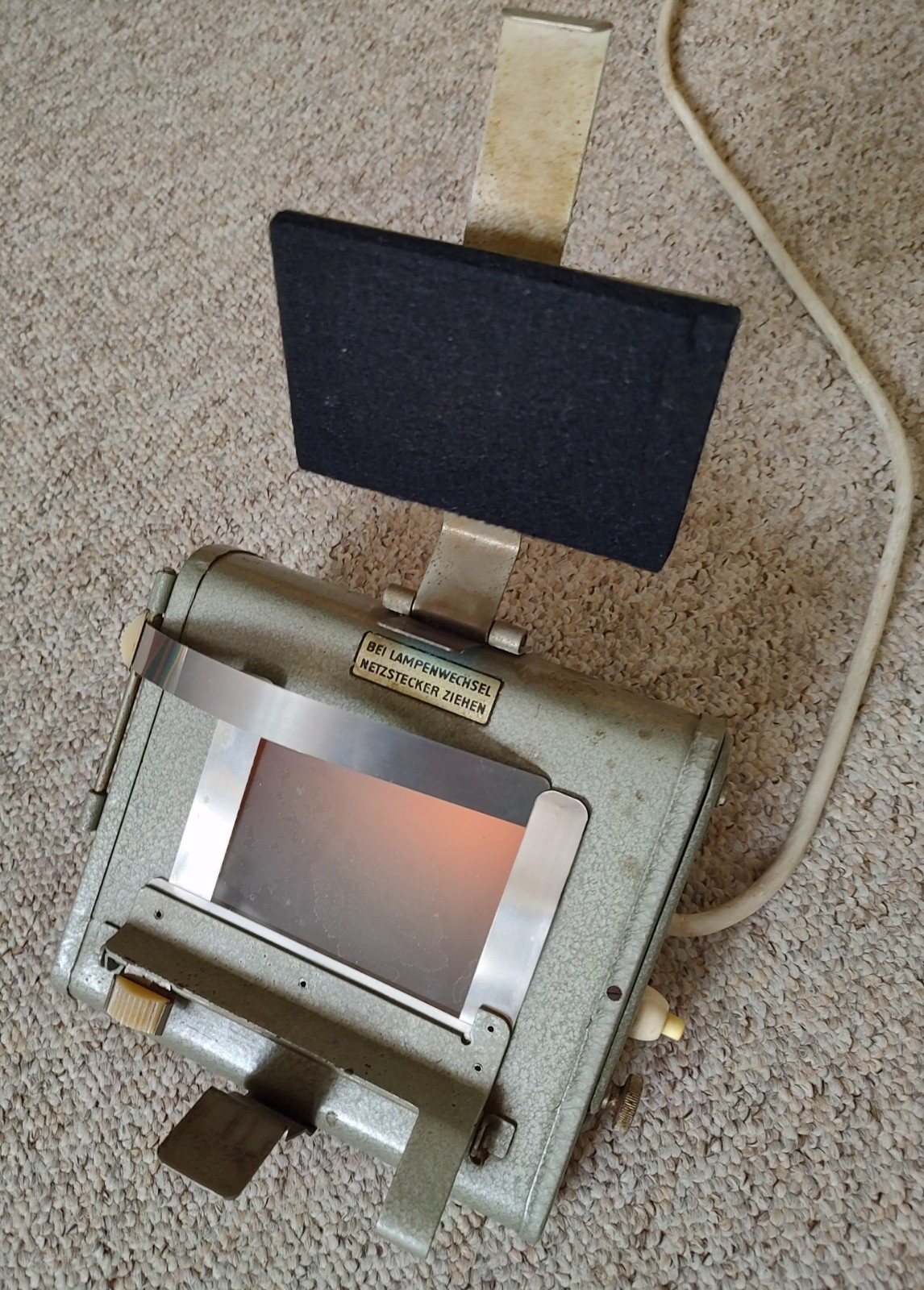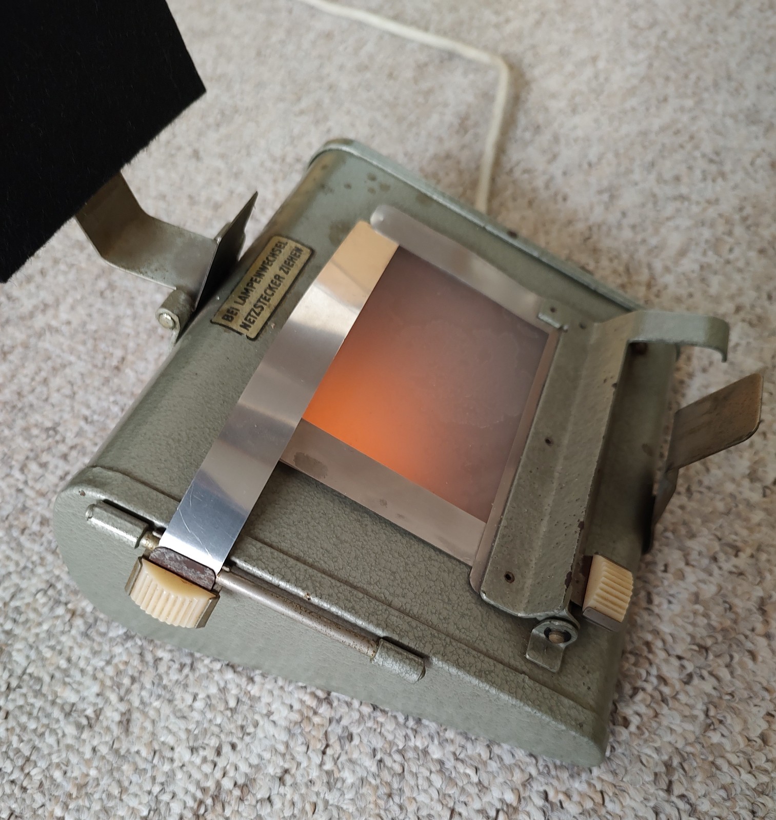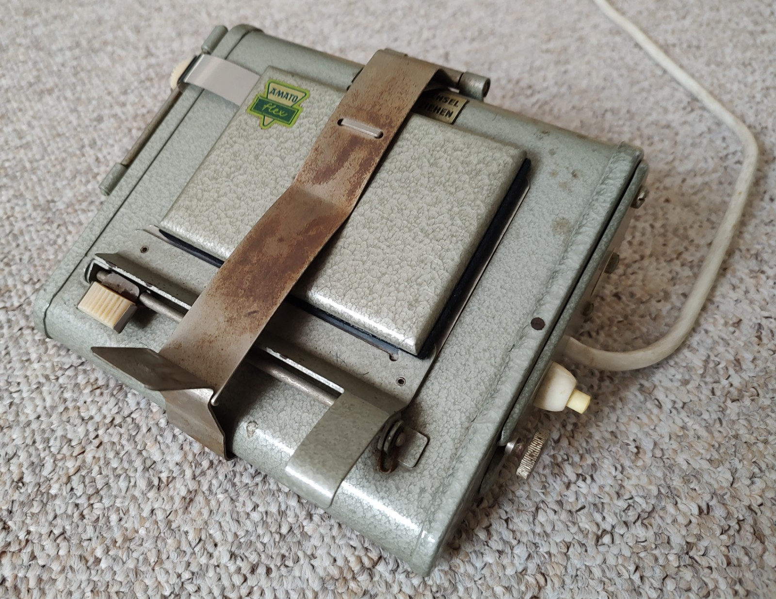 Jetzt ist auch der oben erwähnte Kindermann "Amatoflex"-Kontaktkopierer (bis zum Format 6x9) eingetroffen, und ich ergänze das Gerät hier noch. Es hat ein Ganzmetallgehäuse. Wenn das Gerät angeschlossen ist, brennt kontinuierlich eine Gelblampe. Betätigt man den Drücker rechts, geht die weiße Kopierleuchte (Röhre) an, die man so lange leuchten lässt, wie es für das Negativ erforderlich ist. Der Klemm-Mechanismus ist sehr fest und drückt Negativ und Fotopapier wirklich völlig plan auf die Glasscheibe.