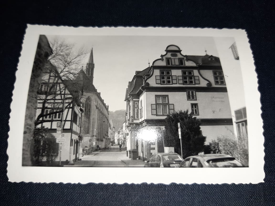 Ich habe das zum Anlass genommen, die 6x6-Kontaktkopien in den heimischen Fotoalben mit der Lupe auf Details zu sichten. Also entweder war 1957 der Film schlechter, oder das Aufnahme-Objektiv, oder die Qualität des Labors. Auf ca. 13 Jahre später erstellten 9x9-Abzügen (gleiche Kamera, die Nettel, auch Agfa-Film normal empfindlich) sind dann wieder wesentlich mehr Details zu erkennen. (auch wieder Bäume, etwa gleicher Anteil am Negativ)