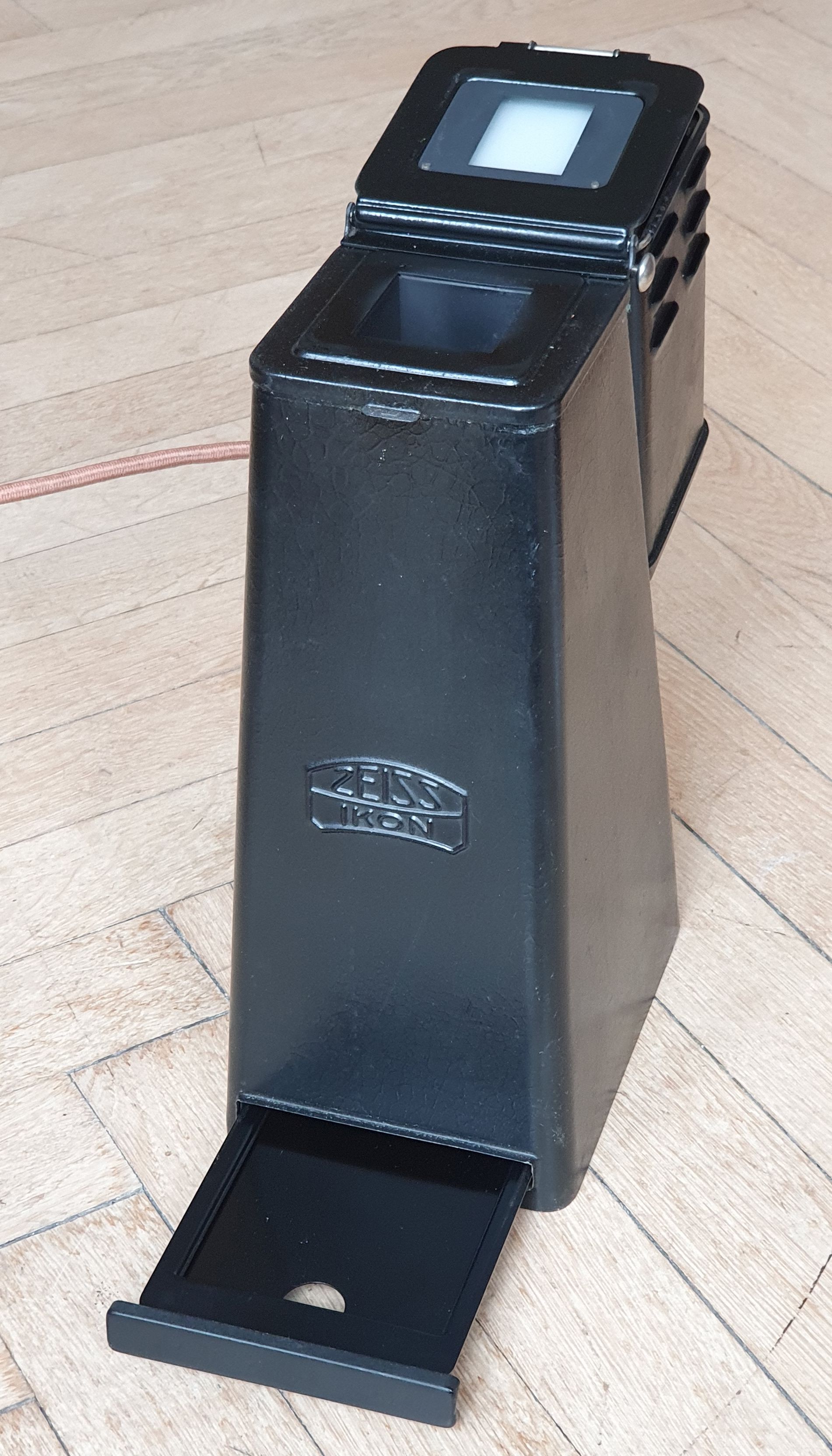 unten folgen die Bilder von dem Zeiss Ikon Vergrößerungskasten Helinox aus Blech mit Beleuchtung. Da es Zeiss Ikon erst ab 1926 gab, muss das Teil auch nach 1926 hergestellt worden sein. Die Vergrößerung ist unveränderlich. In der Negativbühne findet maximal ein Negativ mit 30x40 mm Platz. Die Abzüge erreichen netto maximal 85 x 115 mm.