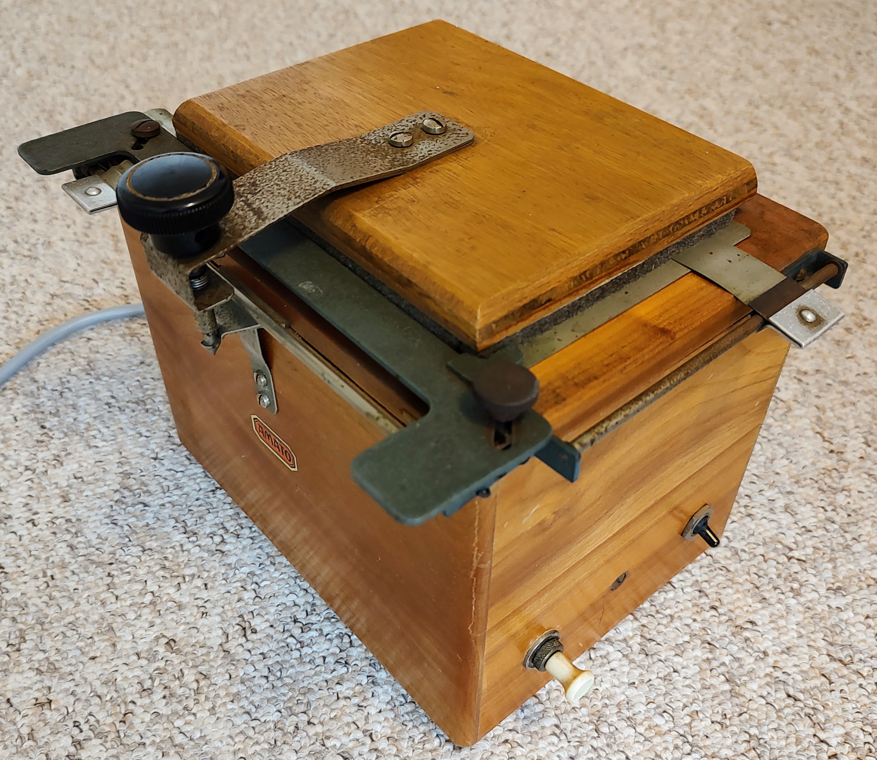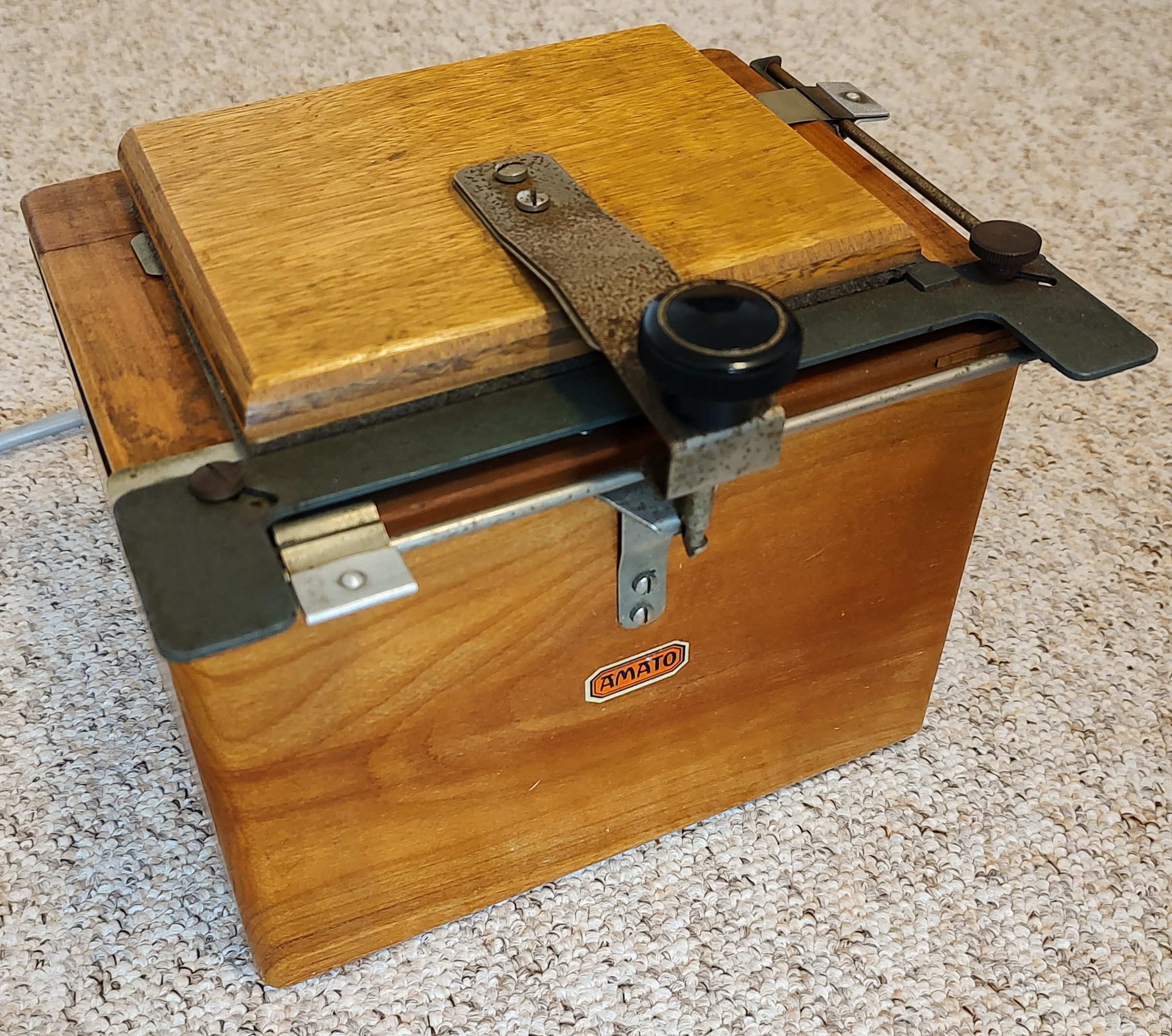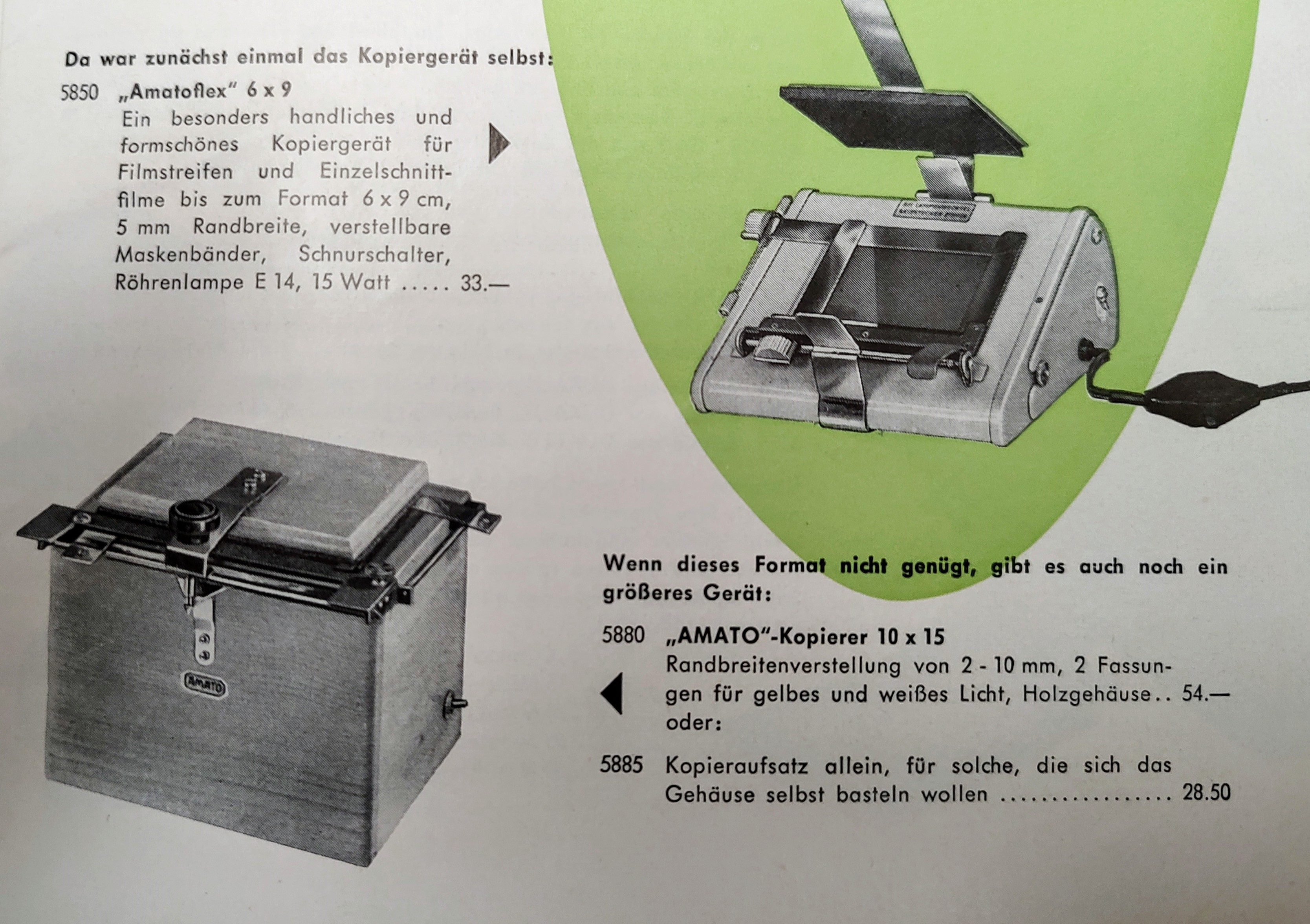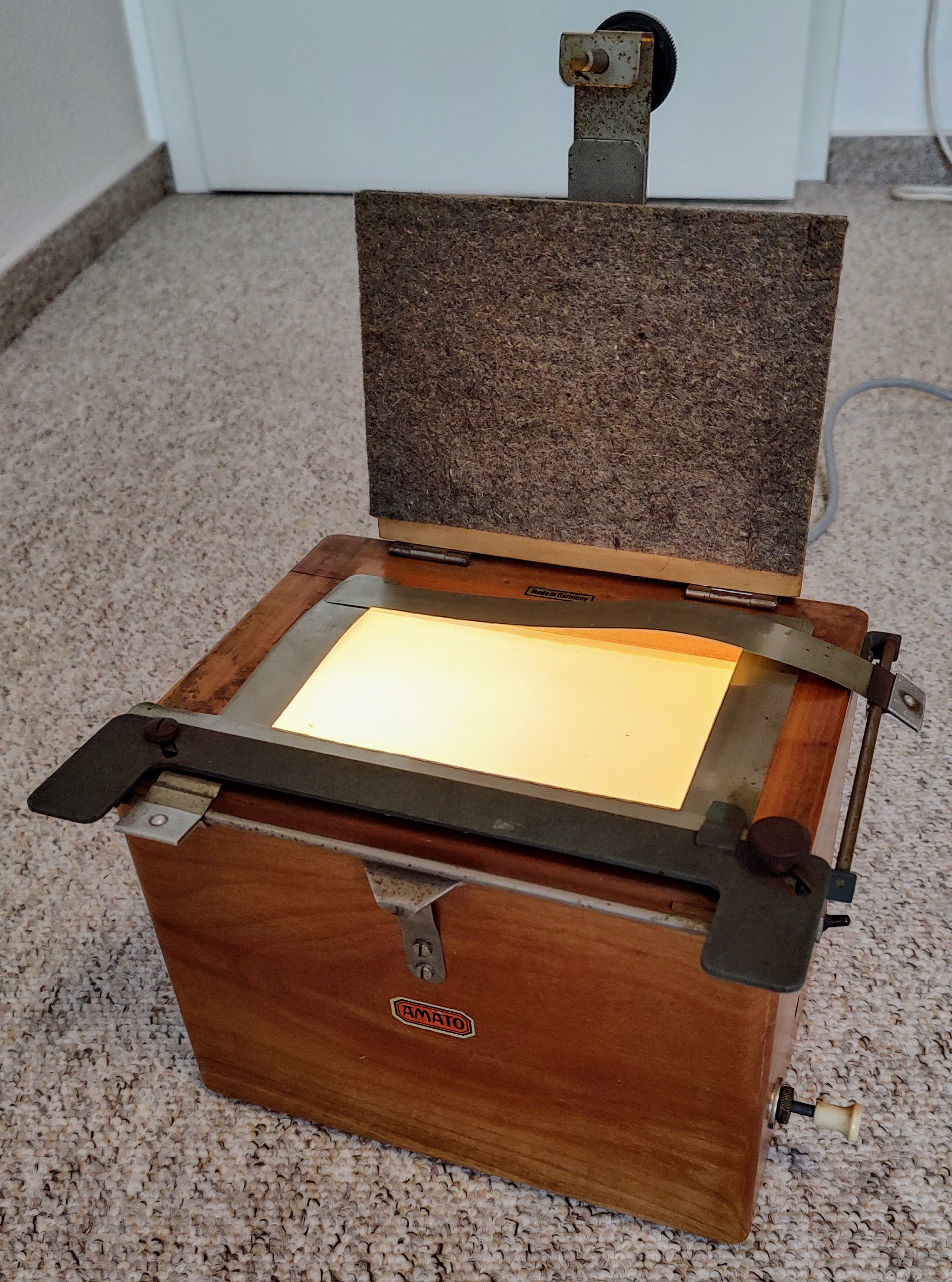 Ich möchte einen S/W-Kontaktkopierer aus den 50er-Jahren vorstellen, den Kindermann „Amato“. Warum Kindermann damals seine Dunkelkammer-Produkte so benannt hat, weiß ich nicht zu sagen. Es gab noch das Kopiergerät „Amatoflex“ und die Vergrößerer „Amatofirm“, „Amatofix“, „Amatolux“ und „Amatosix“, außerdem die „Amato“-Trockenpresse, den „Amato“-Diabetrachter, einen „Amato“-Belichtungsmesser (aus Bakelit) sowie die „Amato“-Schneidemaschine. Vielleicht spielt die Produktlinie auf das Wort „Amateur“ an, denn das waren alles Geräte für das Heimlabor, oder ist gar das italienische „amato“ gemeint (‚Geliebte‘)? Vielleicht waren aus Marketinggründen beide Assoziationen erwünscht.