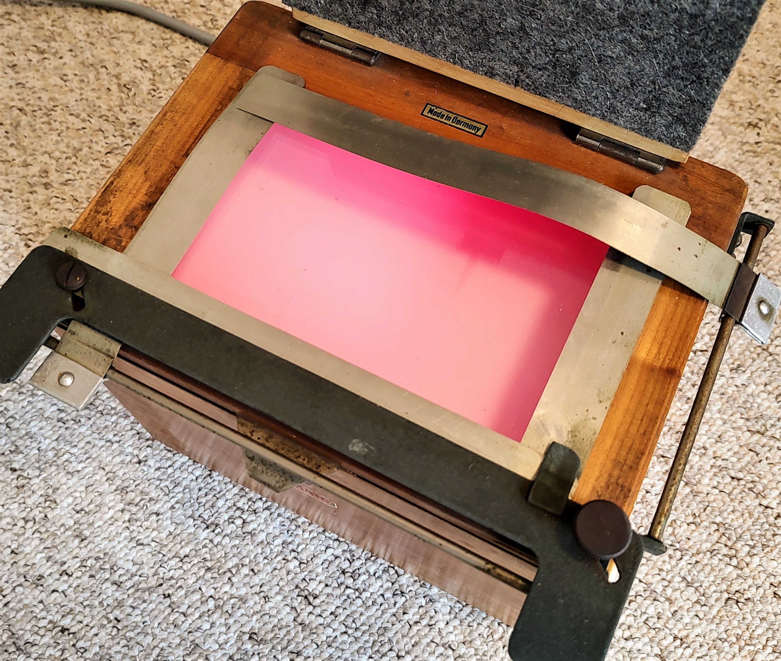 Der Kindermann Kontakt-Kopierer nutzt Mattscheibe und helle Innenwände für eine gleichmäßige Ausleuchtung. Es ist sicher interessant, wie das der Schäfe bekommt.