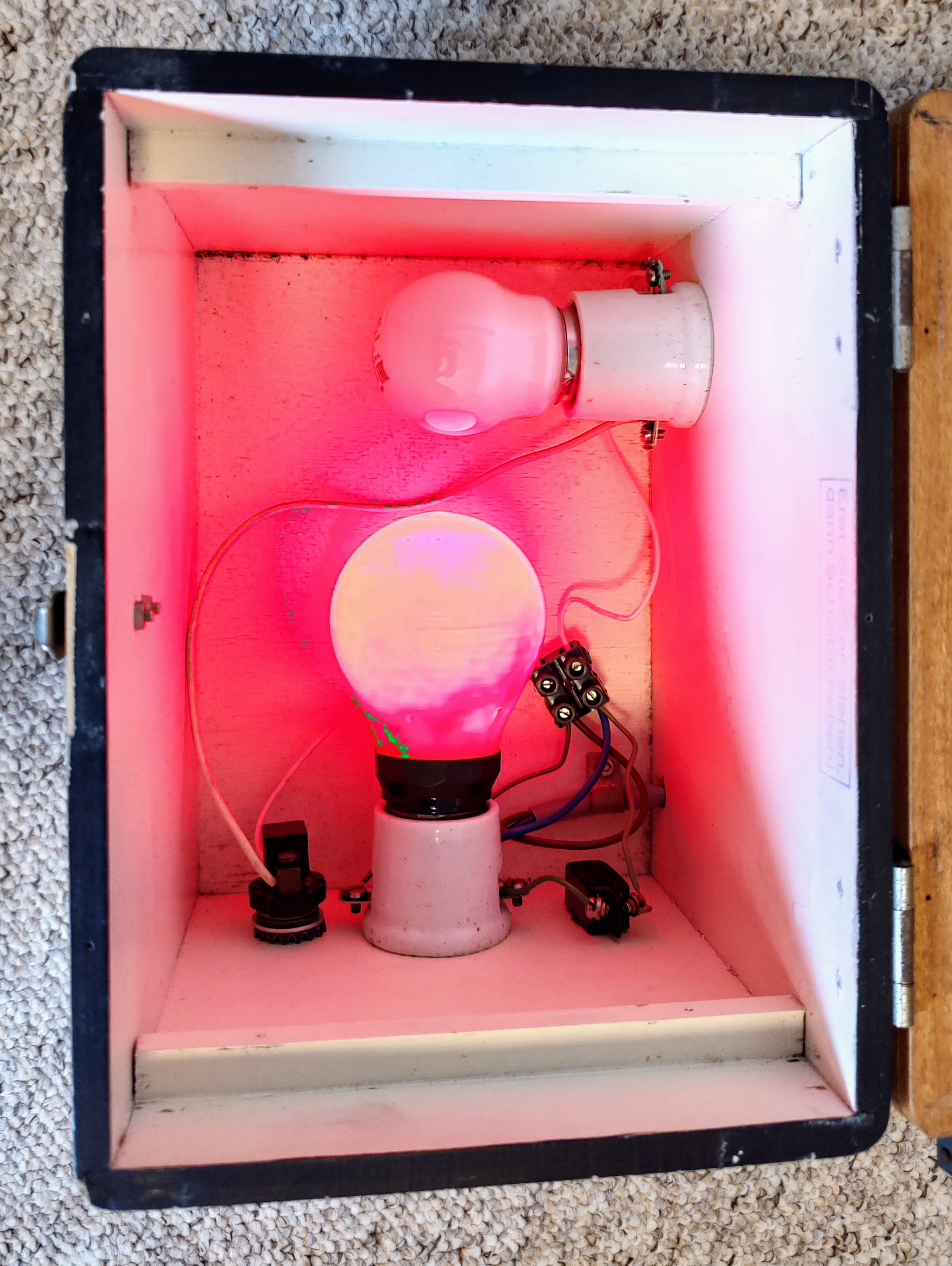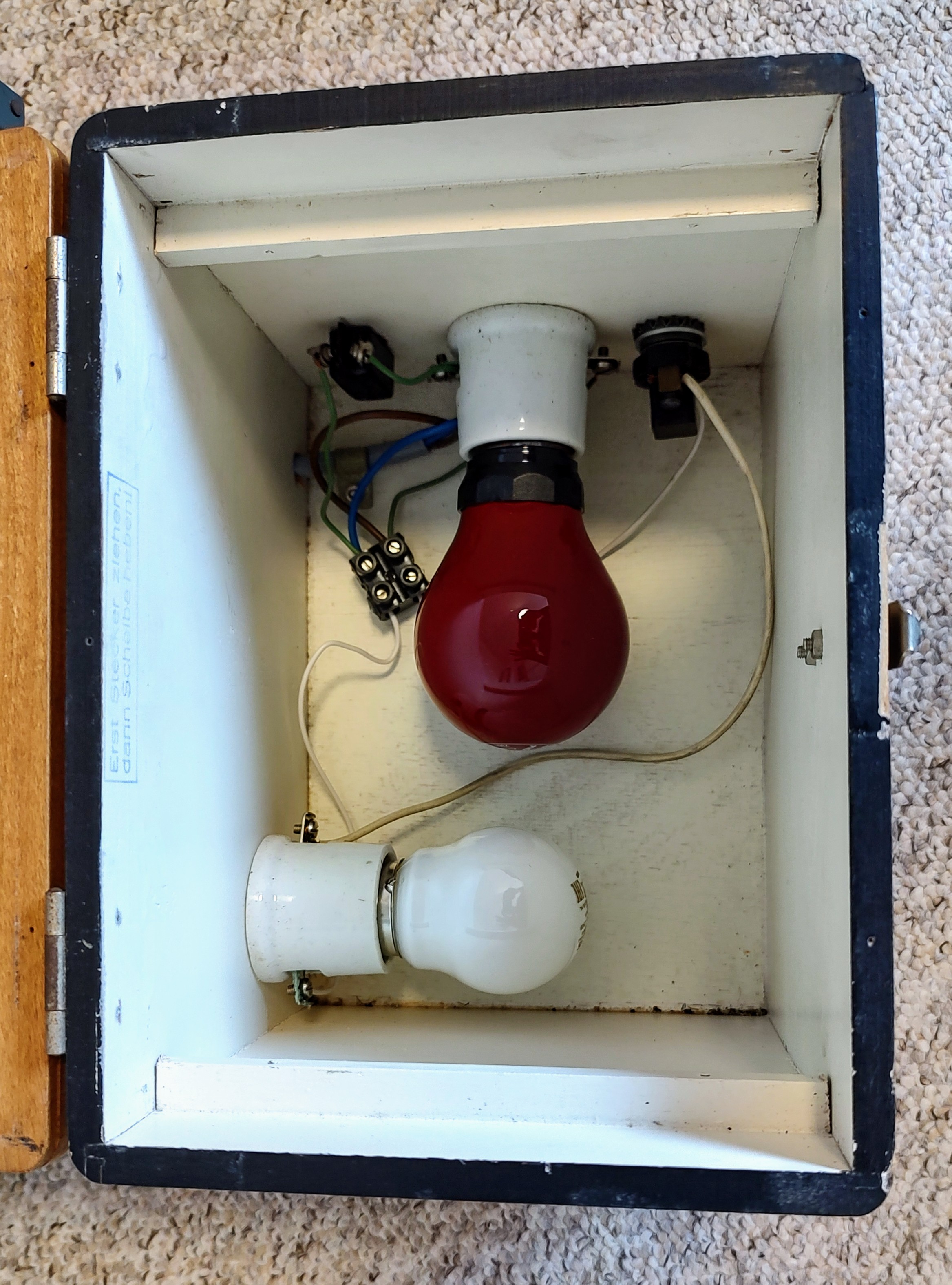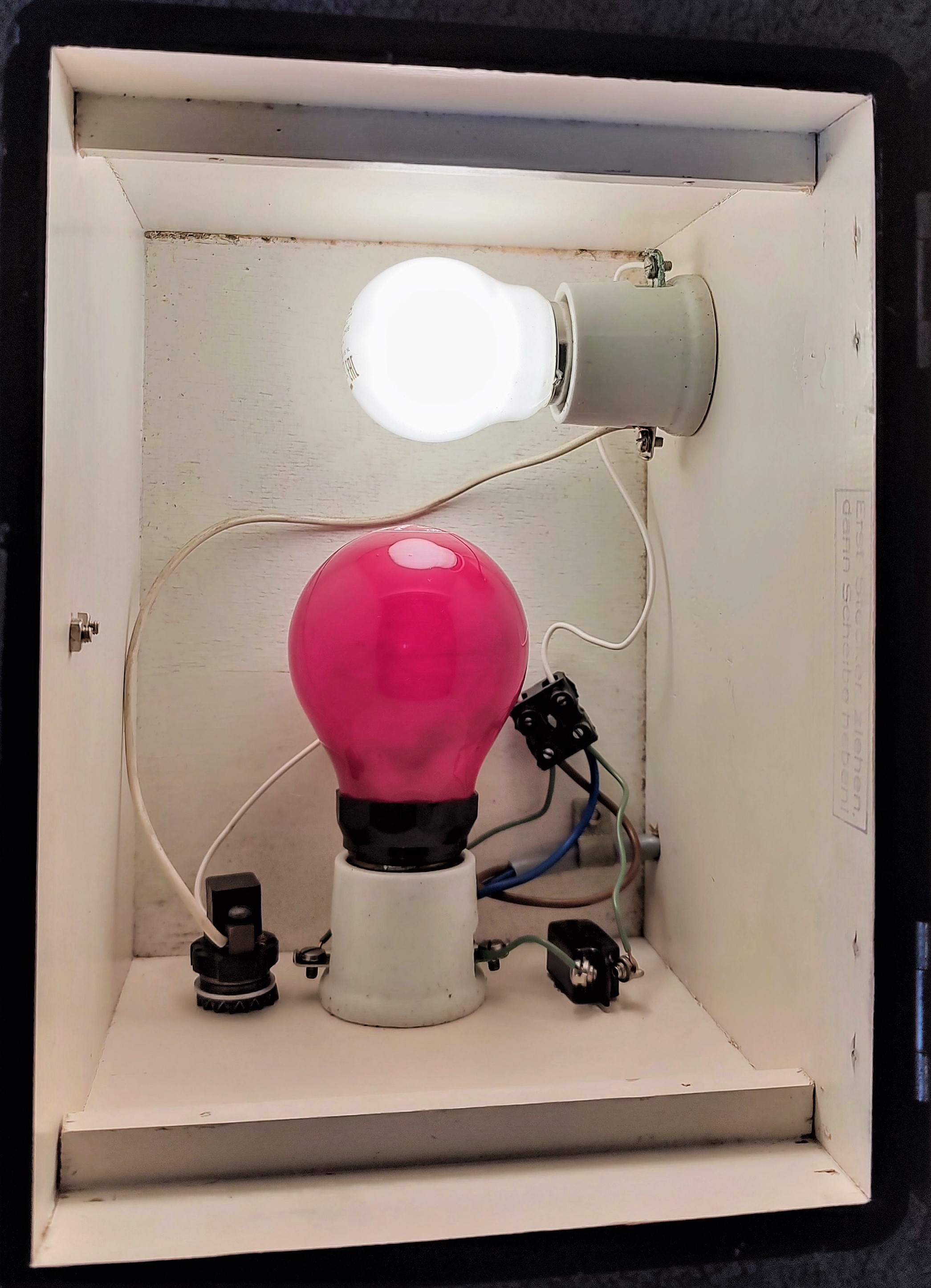 Technisch gesehen handelt es sich um eine Holzkiste mit einer Lampenfassung für rotes und einer für weißes Licht (beide E27). Von den beiden Kindermann-Kopierern war dies das ‚gehobene‘ Modell (s. Prospekt) und kostete damals immerhin 54,- DM. Ein Kippschalter an der Seite schaltet das Gerät ein, dann leuchtet konstant die rote Dunkelkammerlampe, und man kann in Ruhe das Fotopapier (bis 10x15 cm) und das S/W-Negativ einlegen und unter dem einrastenden Deckel fest und plan auf die Glasplatte drücken. Die Lampe für die Belichtung geht zusätzlich an, wenn man den weißen Schalter herauszieht, eben so lange, wie es das eingelegte Negativ für eine schön durchgezeichnete Kopie erfordert (Labor- oder Stoppuhr hilfreich).