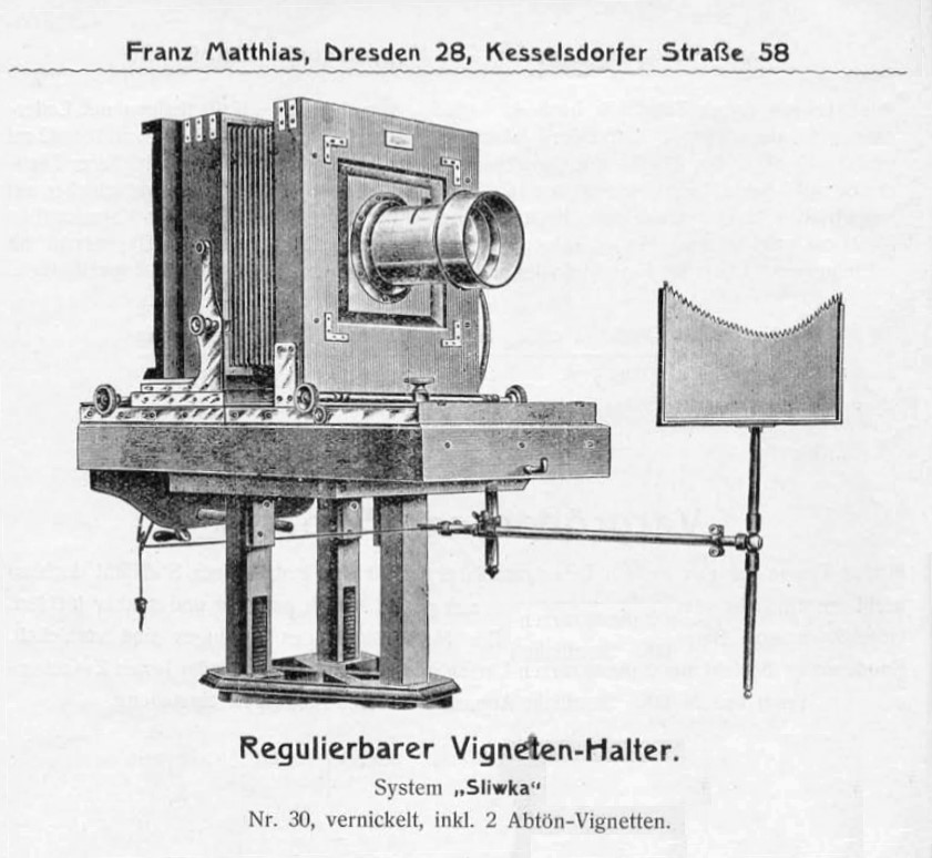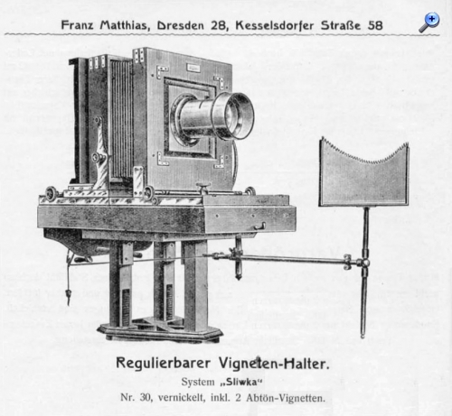im Mathias-Katalog von 1924, Seite 6 im Kapitel über Vergrößerer wird ein Vignettenhalter für Vergrößerungsapparate?? / Kameras ?? vorgestellt. Gut: Vignettenhalter deute ich als ein Abwedelinstrument um beim Herstellen von Papierabzügen starke Kontraststellen in Hell/Dunkelzonen im Bild abzuschwächen.
