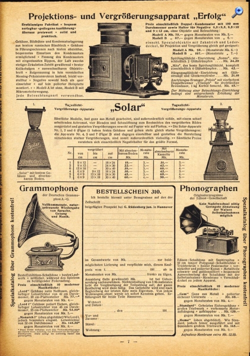 ich habe jüngst ein Faltblatt/Werbeprospekt der Firma G. Rüdenberg Jun erstanden, in dem Tageslicht-Vergrößerer angeboten werden. leider kann ich das Datum nur schätzen, da keines angegeben wird, und die Kameras völlig unbekannt sind, womöglich für den Verkäufer umgelabelt. Der einzige Anhaltspunkt ist das im Faltblatt angebotene Plaubel Peco Akinometer, das etwa 1910 aufkam. Leider erfährt man nichts über die Bedienung der Vergrößerer nur kurze Infos über die Vorteile, ein Werbeblatt eben.