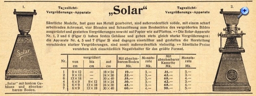 Leider hab ich absolut keine Unterlagen gefunden. Ein Blick in meinen ältesten Porst, 5. Auflage, fördert zwar schon skurrile Geräte zu Tage, die sind aber schon alle auf dem Weg zum üblichen Vergrößerungsgerät mit Beleuchtung. Der Vertrieb der Tageslichtvergrößerer sollte also noch vor 1928 liegen.
