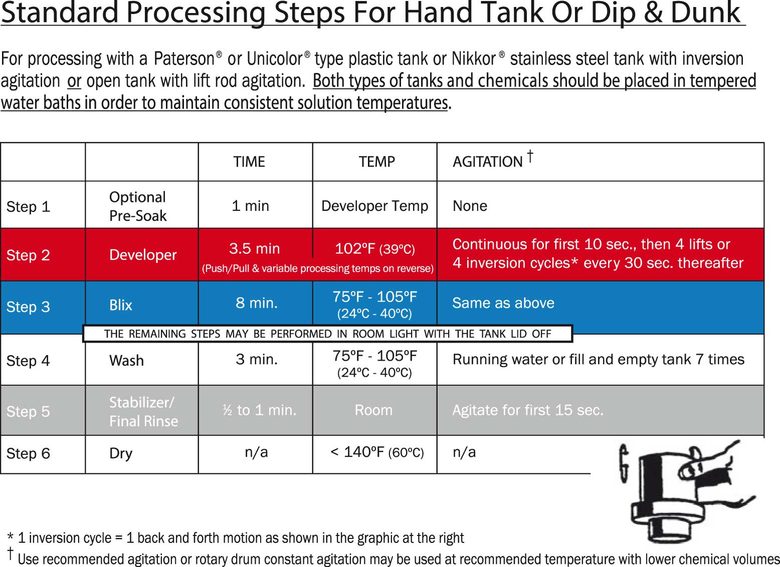 Entwickeln 7 min 30 s 29,5 °C Bleichen ? min ? °C Wässern ? min ? °C Fixieren ? min ? °C Schlußwässerung ? min ? °C Stabilisierungsbad ? min ? °C