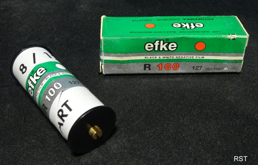hier ein 127-Film-Format 100 ASA Schwarz-Weiss-Film von efke. Ist für 8 Aufnahmen 4 x 6,5 cm Negative. Dieses Rollfilm-Format hat sich in Deutschland nur begrenzt durchgesetzt,