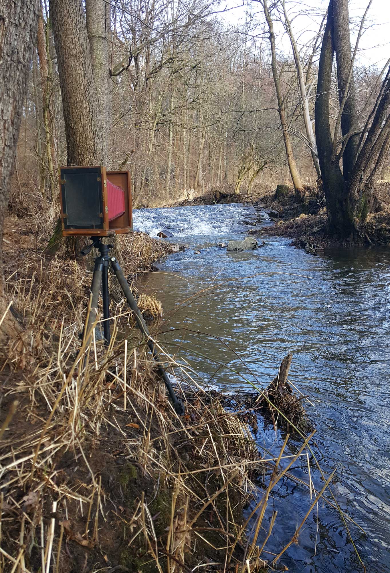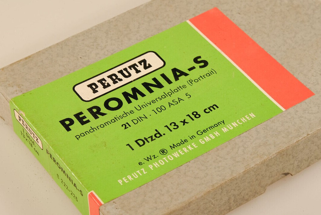 Der Testkandidat war eine „panchromatische Universalplatte“ Perutz Peromnia-S mit 100 ASA. Auf der Packung findet sich leider keinerlei Datierung. Belichtet habe ich die Platte dann wie 32 ASA (2 Sekunden bei Blende 22). Hier der Aufnahmeaufbau: