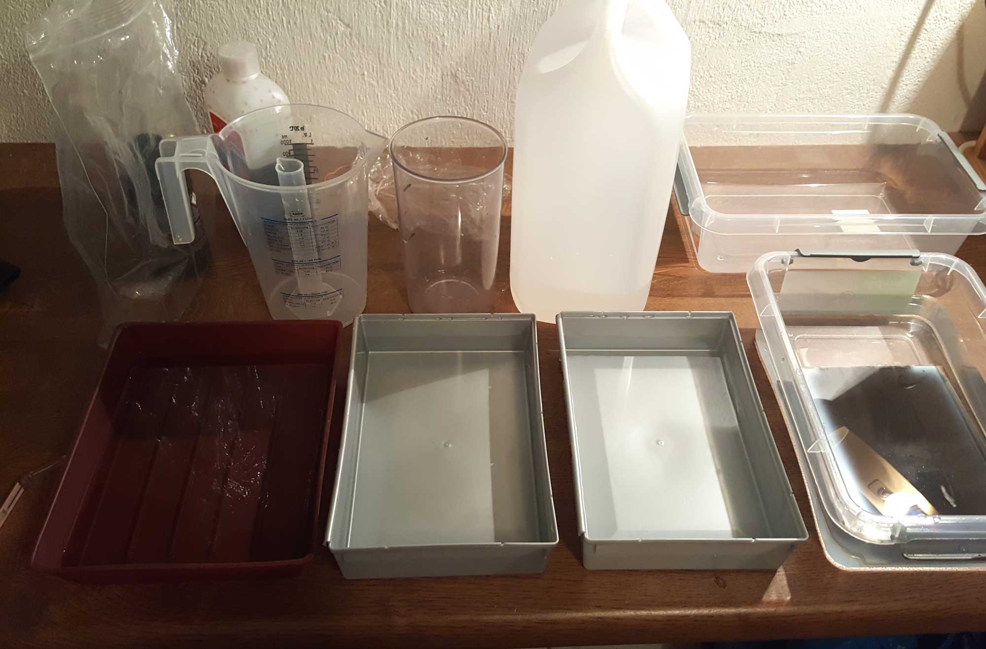 Abends ging es dann in den Keller ans Entwickeln: Rodinal 1:50, 13 Minuten, bei 20 Grad. Ein Blick auf die „Laboranordnung“ (die entwickelte Platte ist ganz rechts in der Schale):