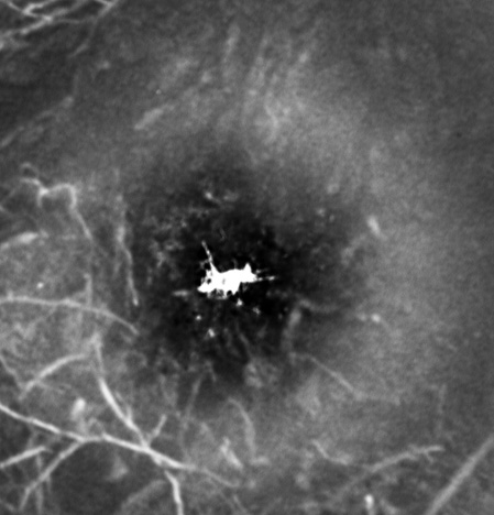 Außerdem finden sich neben einem größeren weißen Schmutzpartikel auch mehrere kleine Beschädigungen der Fotoschicht. Um diese Beschädigungen herum sind ebenfalls Aussilberungen (kreisrund) zu festzustellen. Hier mal die größte Beschädigung im Detail: