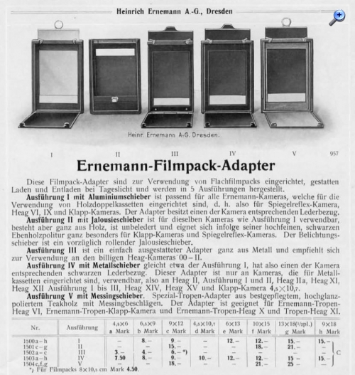 Hier noch ein Auszug aus einem Ernemann-Katalog von 1914 der ein Angebot verschiedener Filmpack-Adapter zeigt: