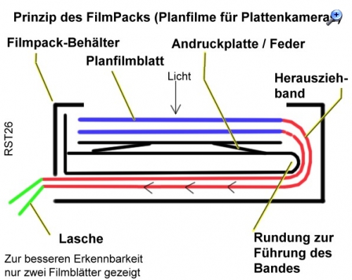 Es ist wohl nicht Jedem bekannt, daß -- wenn man nach einer Aufnahme die nächst folgende Lasche am Filmpack zieht um die nächste flexible Planfilmscheibe in die richtige Position zu bringen -- bei diesem Ziehen wird die gerade belichtete flexible Planfilmscheibe über eine interne Rundung nach hinten im Pack verbracht (gezogen). Die Filmpack-Blätter waren dünner als die normalen Planfilmblätter (Scheiben) um besser um die Rundung (siehe Skizze) im Behälter zu kommen.