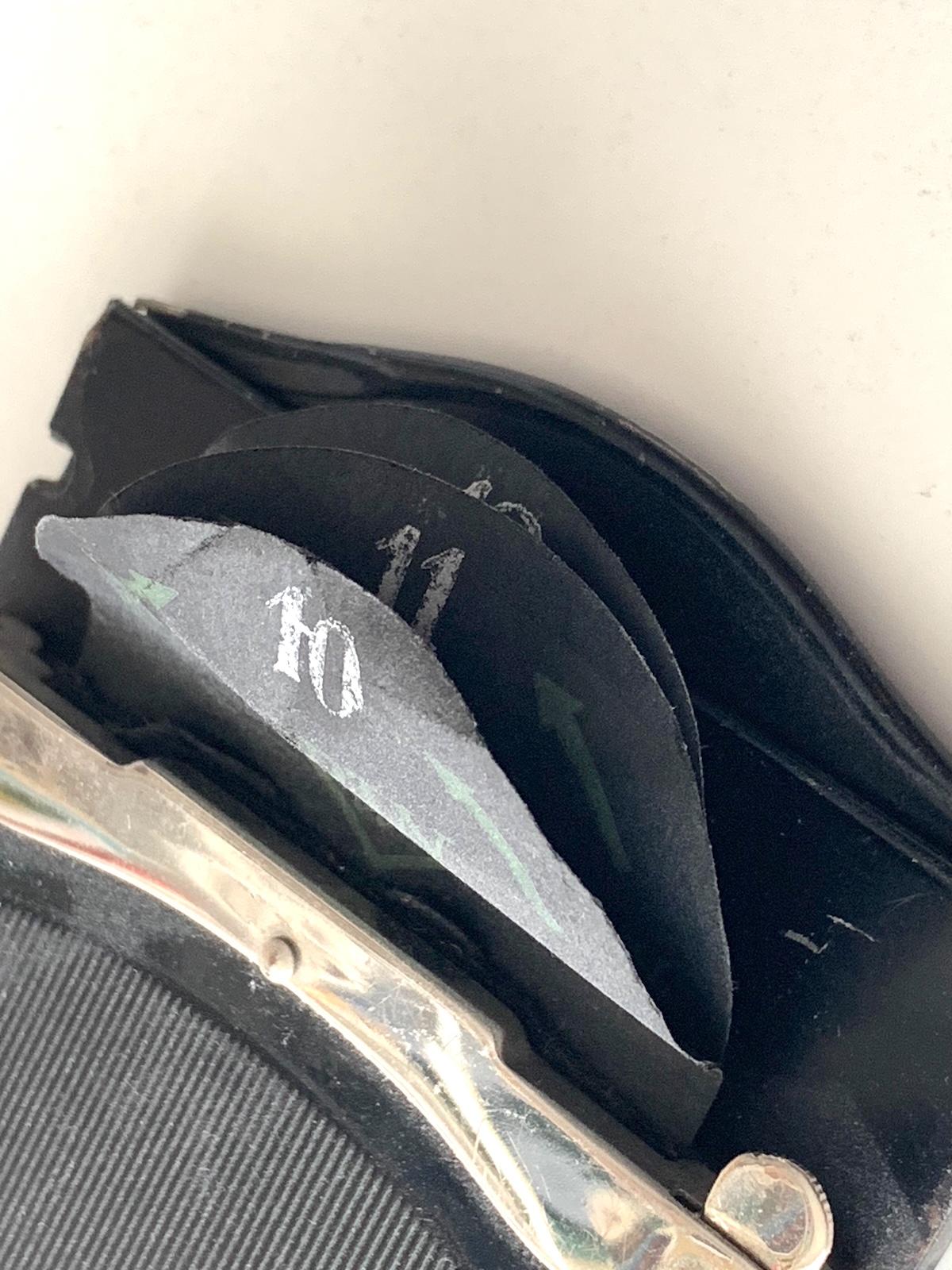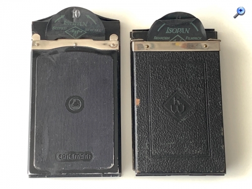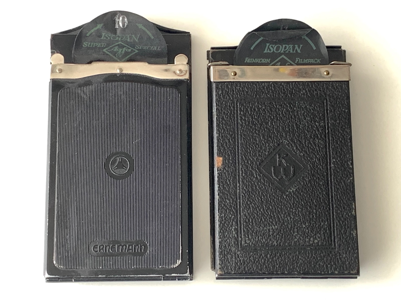 Hier zwei noch gefüllte Filmpackkassetten 6,5x9 (links Ernemann, rechts KW Patent-Etui). Man erkennt die erwähnten Laschen, mit denen der Wechsel des Filmblattes vorgenommen wird. In beiden Kassetten stehen noch die Filme 10–12 zur Verfügung.