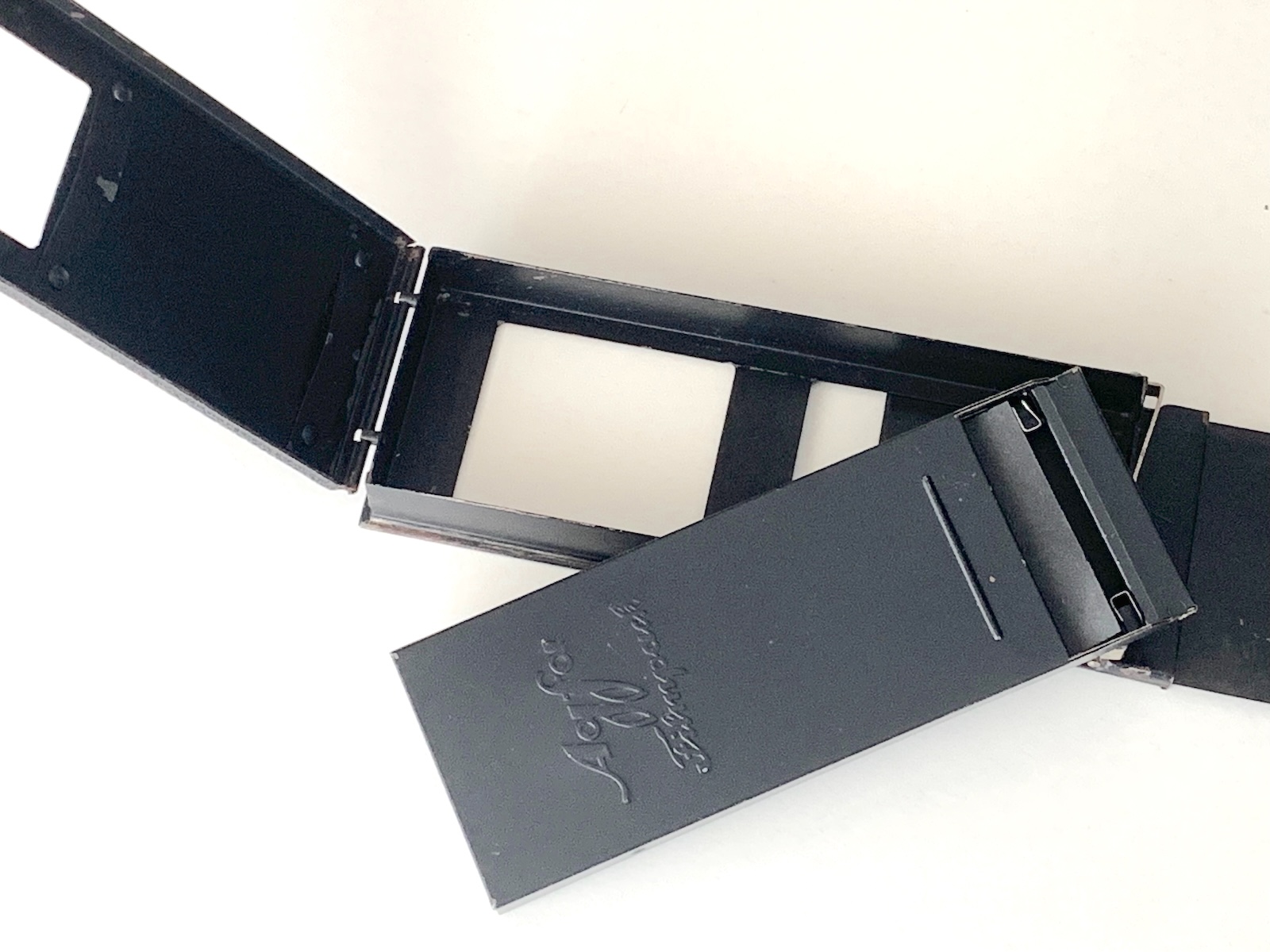 Im folgenden Bild ist eine geöffnete Kassette (Stereo 4,5x10,7) mit herausgezogenem Dunkelschieber zu sehen, außerdem die (leere) äußere Hülle eines Filmpacks, das sich noch darin befand. Darunter die Hülle von der anderen Seite.
