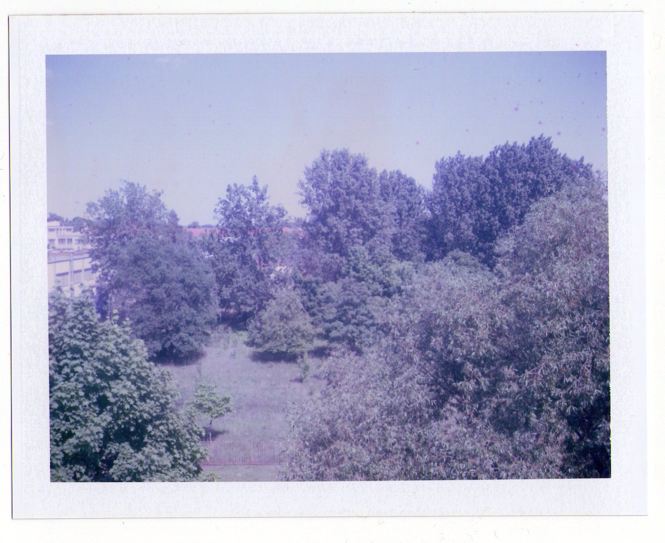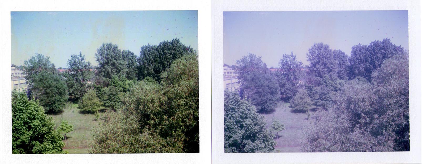 Der Fuji FP 100 C hat, wie schon der Name sagt, eine Lichtempfindlichkeit von 100 ISO. Wie deine Testbilder zeigen ist das Material leider schon überaltert und vermutlich nicht Artgerecht (Kühlschrank) gelagert worden. Gegen den Purpur- Blaustich der Bilder kannst du nichts machen - nur die Bilder in der nachträglichen Bildbearbeitung zu verbessern ist möglich. Siehe dein Parkfoto unten: