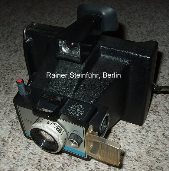 eine der vielen Polaroid-Kameras. Dieses Modell (wie auch die Colorpack II) nutzten einen Zwischennegativ-Verfahren. Nach der Entwicklung (nach dem Herausziehen des Film-Bildes) trennte man Positiv vom Negativ. Nach einer chemischen Behandlung durch Abwischen mit Natriumsulfitlösung des Negativ-Teils (eine Art Fixierung) konnte das Negativ später auf klassische Weise im Labor für die Herstellung weiterer Abzüge verwendet werden. So war es möglich die Fotos vom Unikat zu "normalen" vervielfältigbaren Abzügen zu machen.