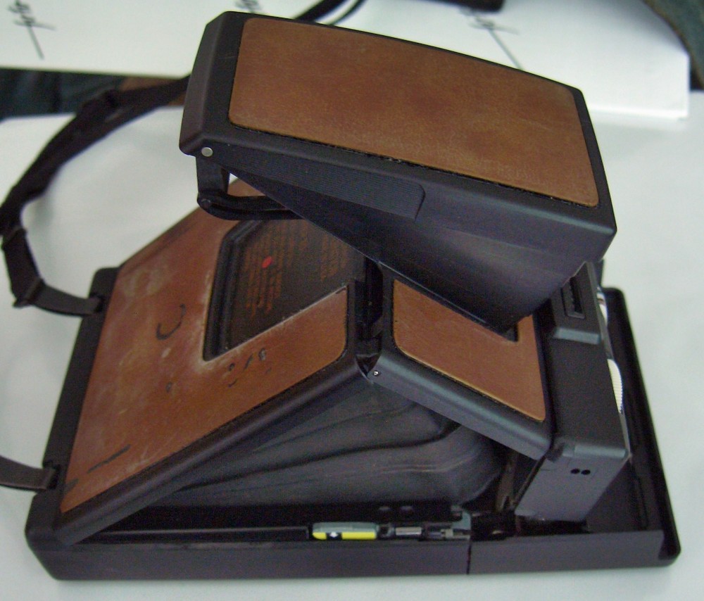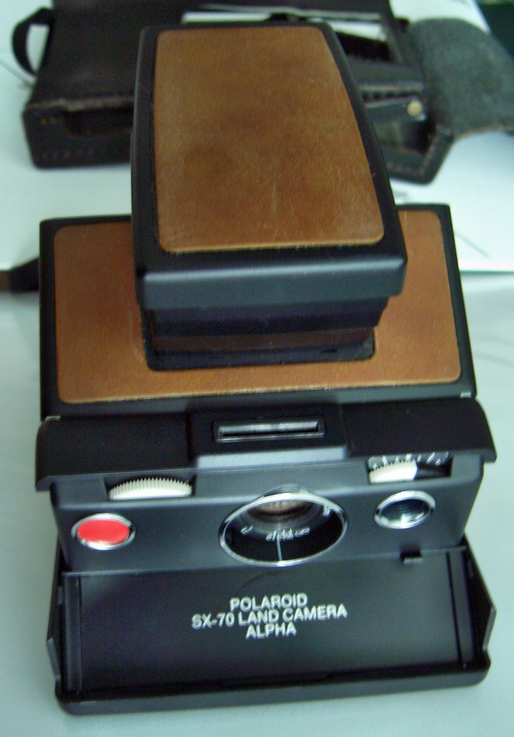 Hersteller, Modell: Polaroid Land, SX-70 Alpha Baujahr: 1977 Filmtyp: SX-70-Film (10 Aufnahmen). Objektiv: 4 Linsen 116 mm u. Blende 8. Fokussierhilfe. Entfernungsskala am Objektiv Verschluß: 10 Sek bis 1/175 Sek Belichtung: Automatik Batterie: 6 Volt im Filmpack. Sonstiges: Stativgewinde. Tragegurt, Aufhellblitz. Motor-Filmauswurf.