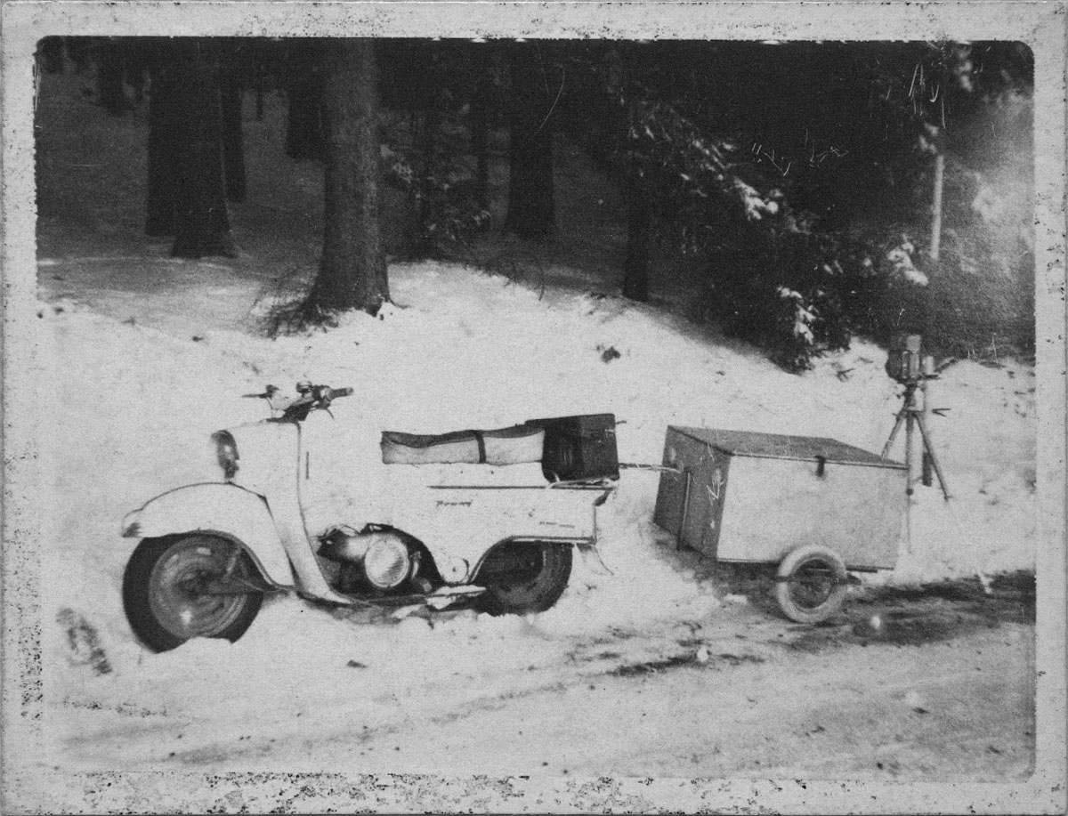Ein "Swinger" Photo vom Winter 1966: Mit dem Moped unterwegs für Landschaftsbilder. In der Anhänger-Kiste war die 6x9 cm Linhof Technika 70 samt Stativ und Zubehör untergebracht.