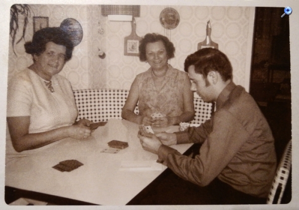 Ein Musterphoto mit der Polaroid Swinger Modell 20 von 1968 "Man spielt Canasta" mit dem Forumbetreiber: