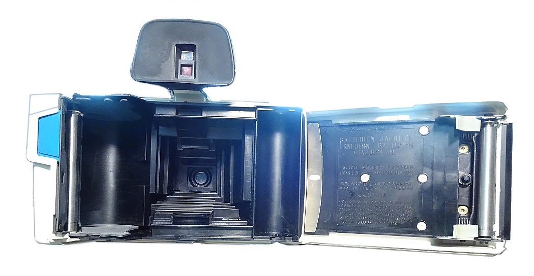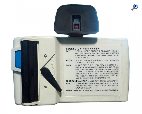 Besonderheiten, Sonstiges: Sofortbildfilm. Der Auslöser ist ein Kombiknopf: Auslöser und (scheinbare) Entfernungseinstellung für Blitz. Bei Nichtblitzaufnahmen wird die Blende an das Licht angepasst. Große Trageschlaufe.