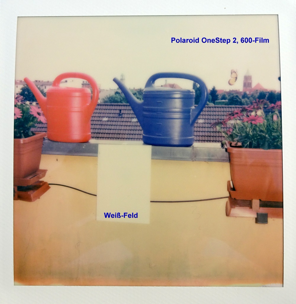 1) 600-Film. Gibt es einen Unterschied, ob ein Film lichtgeschützt oder nicht-lichtgeschützt entwickelt wird? Die Polaroid Originals-Filme sollen - so die Anleitung - lichtgeschützt entwickelt werden, die OneStep 2 ist dafür durch die ausrollbare Lichtschutzfolie vorbereitet. . Ich habe mal getestet, was passiert, wenn man sich nicht daran hält (halten kann). Mein Ergebnis: Ich sehe keinen Unterschied. Übrigens ist das Foto zuerst eine eher dunkle Fläche, die Lichter tauchen erst im Laufe der Entwicklungszeit auf.