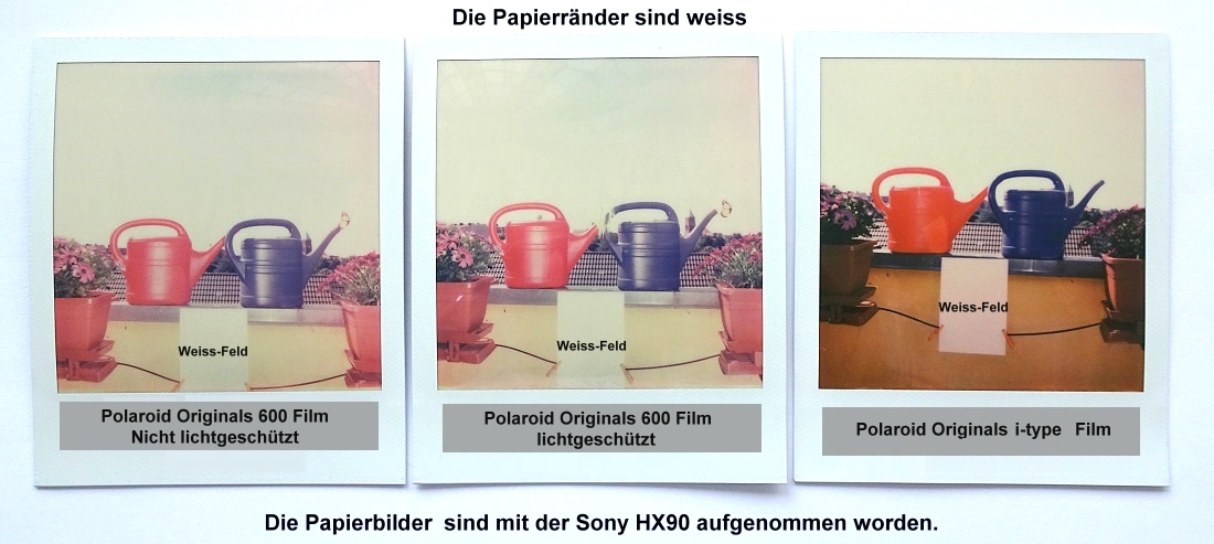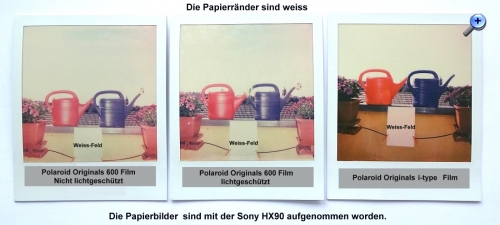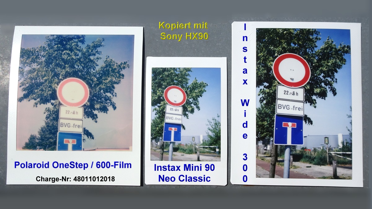 Die drei Papierbilder der Sofortbildkameras wurden dann mit der Sony HX90 "kopiert", etwaige Farbfehler dieser Kamera sind dann gleich bei den drei Fotos und fallen sozusagen heraus. Kann kann natürlich auch bei den Instax-Fotos auch leichte Farbverschiebungen annehmen, die wohl aber deutlich geringer ins Auge fallen.