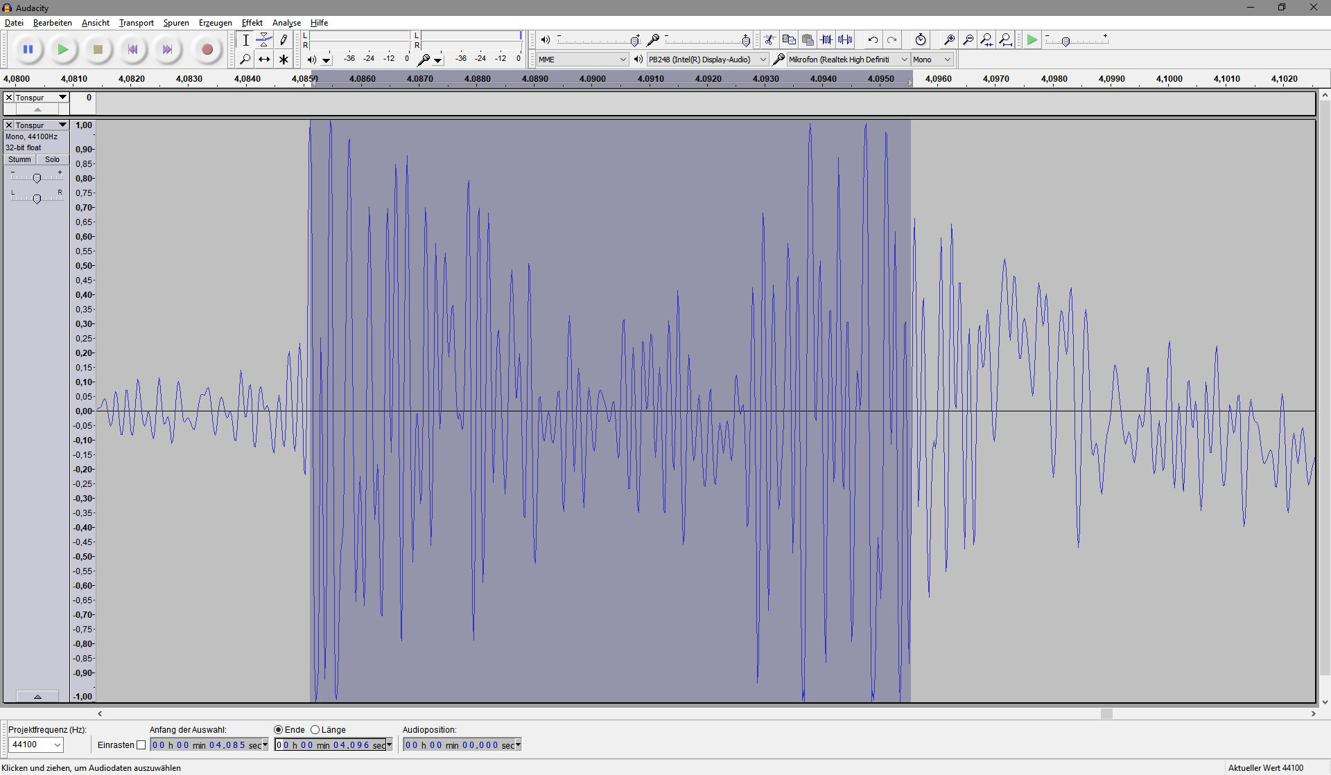 Unten sieht man Anfang und Ende des Messbereichs in Millisekunden gemessen Hier also von 4.085 bis 4.096 = 0.011 Sek.. Das entspricht, wenn ich richtig rechne, 1/90 Sek.