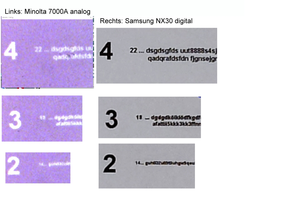 Nun der direkte Vergleich Minolta 7000AF analog vs Samsung NX30 digital: Es wurde der BZF-Digitalkamera-Test genutzt und auf möglichste Vergleichbarkeit geachtet. BZF-Vergleichstest: http://www.blende-und-zeit.sirutor-und-c...ad=1&page=1