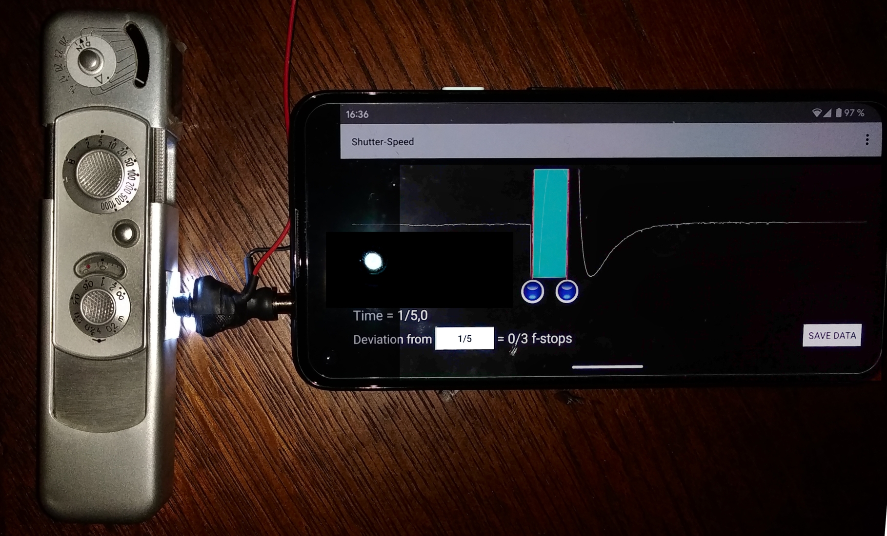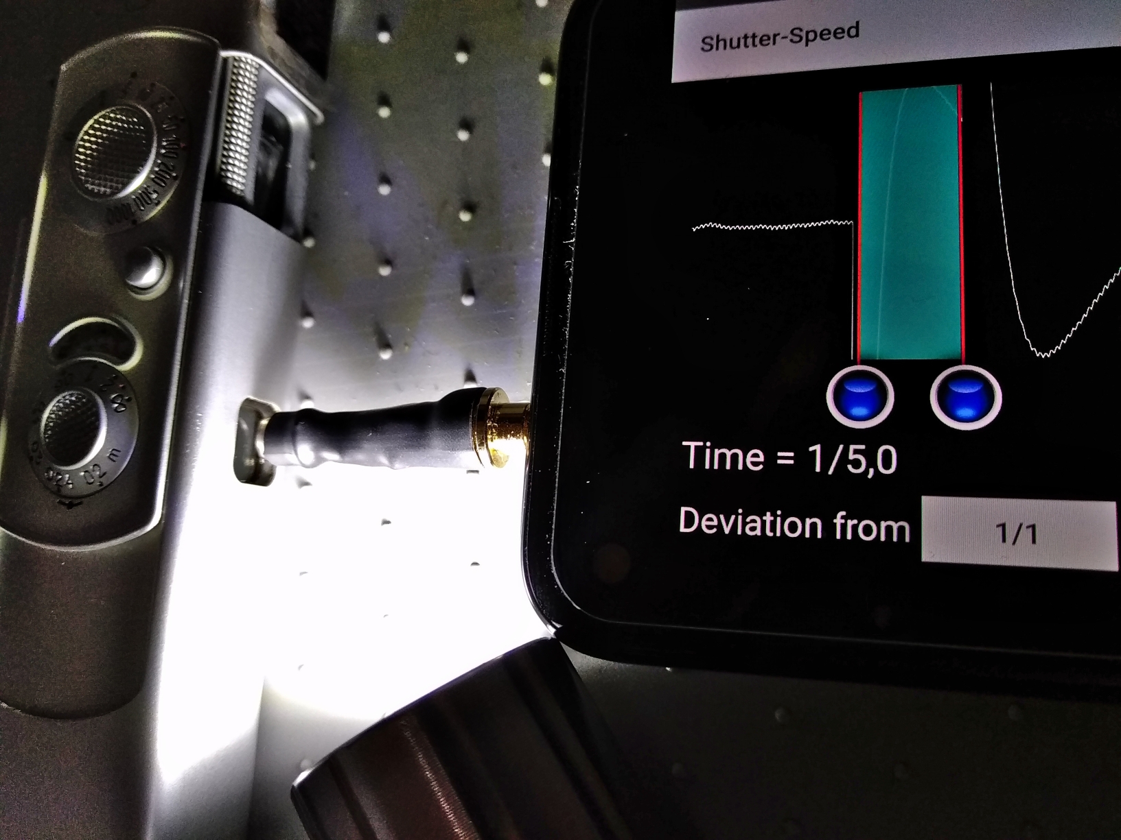 Tatsächlich kann ich damit die Belichtungszeiten sogar einer Minox nachvollziehen. Die akustische Messung ohne den optischen Sensor funktioniert bei den Minoxen garnicht, weil das Verschlussgeräusch nicht signifikant ist. Da aber die Verschlusslamellen der Minox so schön spiegeln, kann man - anders als bei Photoplug eigentlich vorgesehen - die Reflektionen des angeleuchteten Objektivs nutzen. Dieses strahle ich dazu mit einer Lampe an.