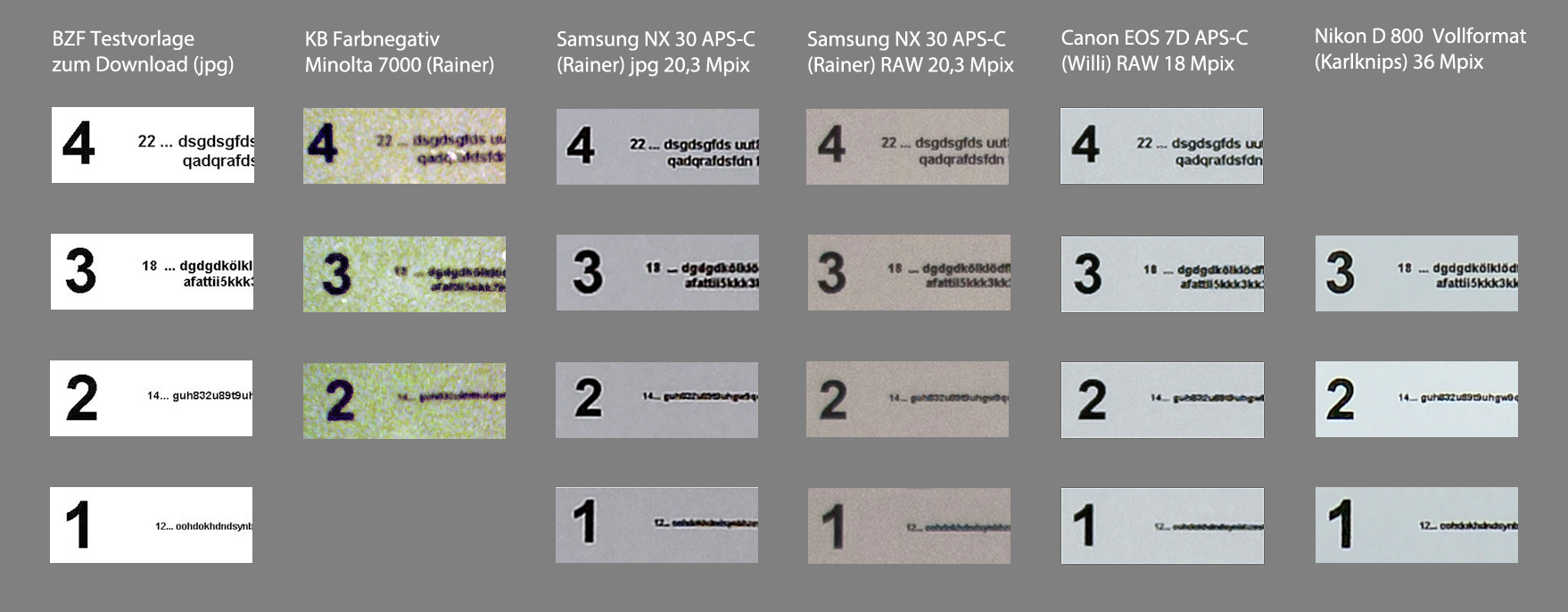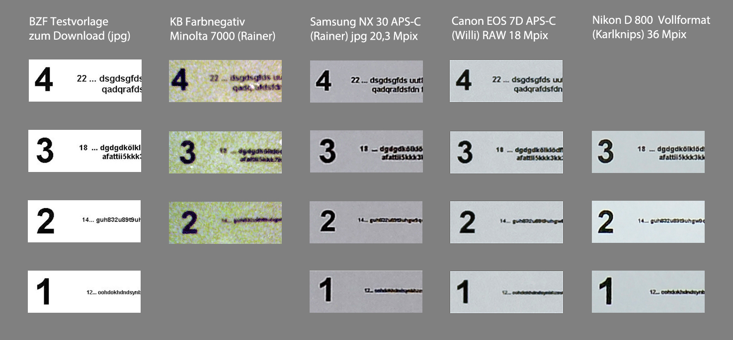 Ich habe jetzt die sehr aussagekräftigen Mikroskopbilder des Analogfilms von Rainer invertiert und den Digitalbildern von einigen Digicams und der Ausgangsdatei der BZF-Testvorlage gegenübergestellt.